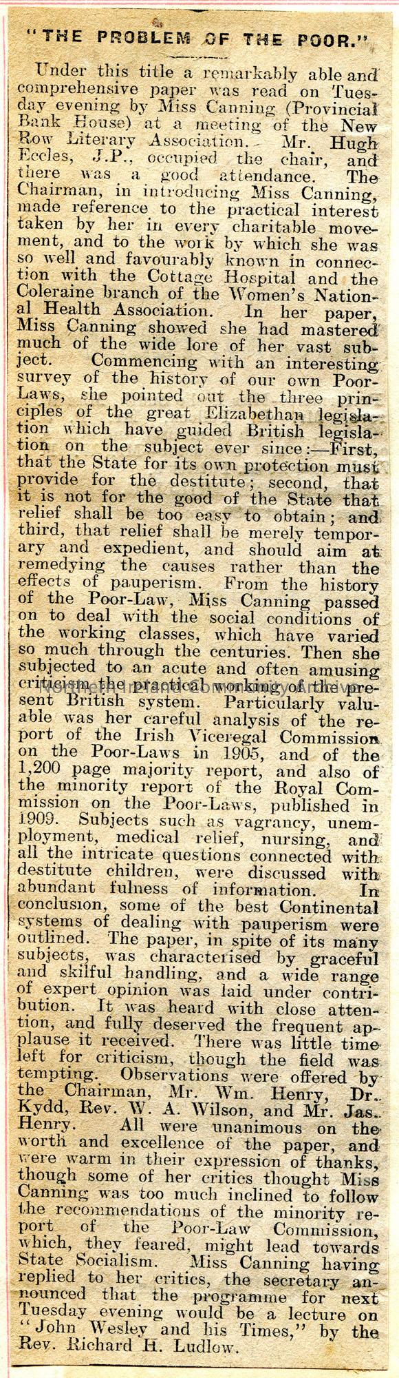 Article cut from a newspaper titled, 'The Problem of the Poor'. Re a meeting at the New Row Literary Association. A talk by Miss Canning, Provincial Bank House, re the Poor Laws.