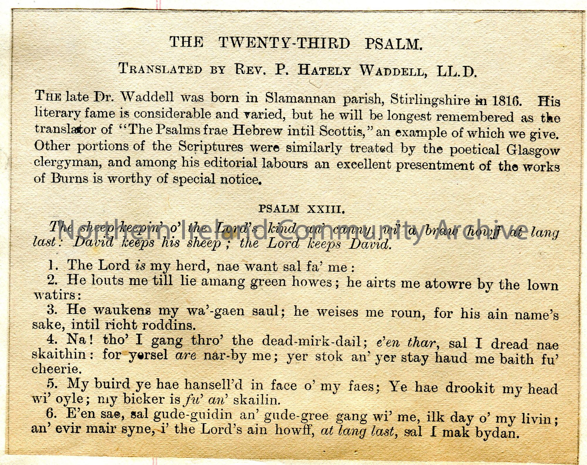 Article cut from a newspaper titled, ‘The Twenty-Third Psalm. Translated by Rev. P. Hately Waddell, LL.D.’