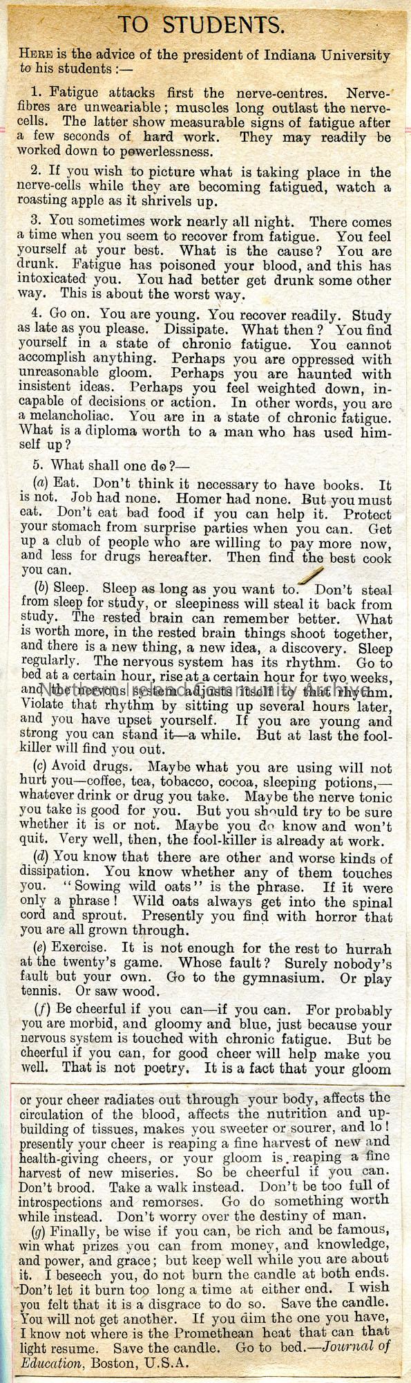 Article cut from a newspaper titled, 'To Students'. Advice on how to battle fatigue by the president of Indiana University. Taken from 'Journal of Education, Boston, U.S.A'.