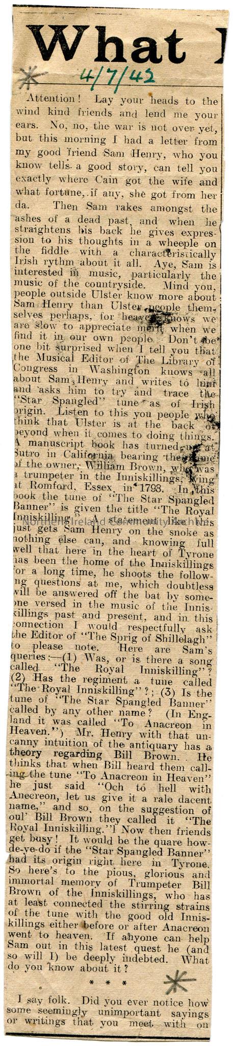 Article cut from a newspaper which asks readers to help Sam Henry with the origin of the song 'The Star Spangled Banner' and its connection with Tyrone and Royal Inniskilling Fusiliers.