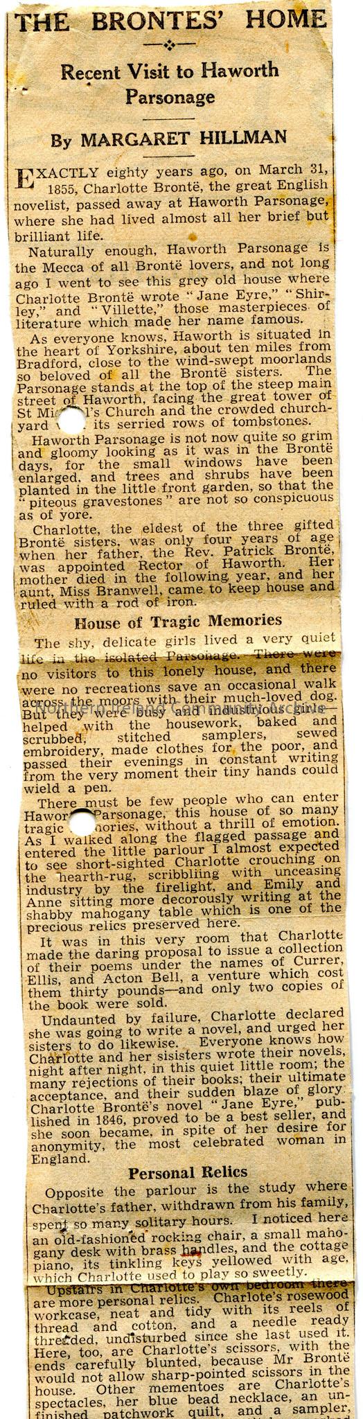 Article cut from a Scottish newspaper. Dated 1935. Titled, 'The Bronte's Home. Recent Visit to Haworth Parsonage'. By Margaret Hillman. Article re the anniversary of the death of Charlotte Bronte on 31st March, 1885.