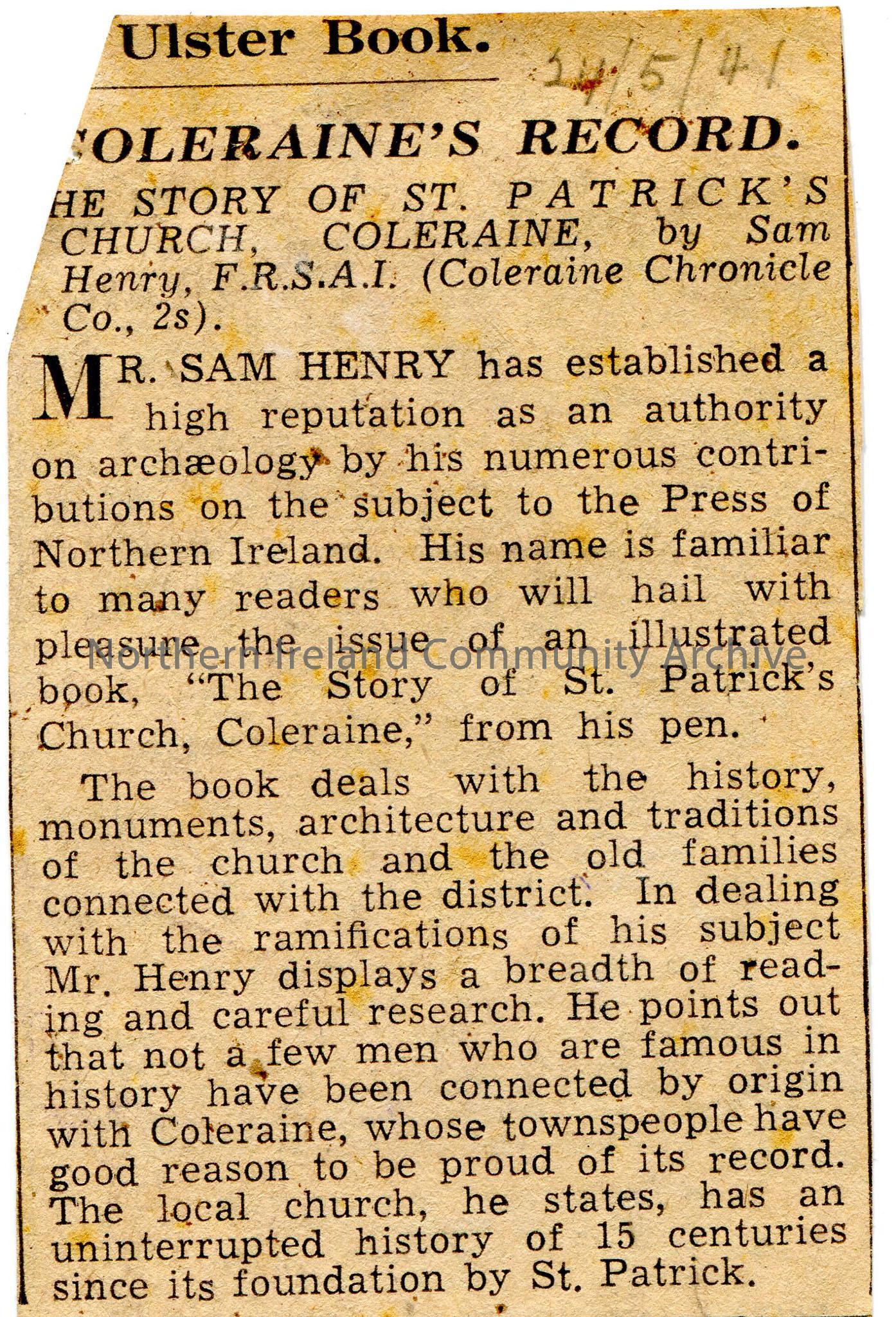 Article cut from newspaper. Dated 24th May, 1941. Titled, 'An Ulster Book. Coleraine's Record. The Story of St.Patrick's Church, Coleraine, by Sam Henry, F.R.S.A.I. (Coleraine Chronicle Co., 2s)'. Review of Sam's Book 'The Story of St.Patrick's Church, Coleraine'.