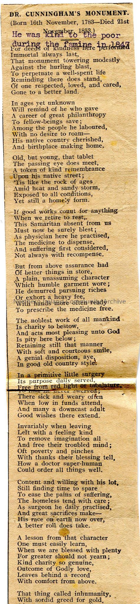 Article cut from newspaper of a poem or words to a song by Alex M'Gladdery, The Logwood Mill, Ballyclare. Titled, 'Dr. Cunningham's Monument'. 'He was kind to the poor during the famine in 1847', typed at top of article.