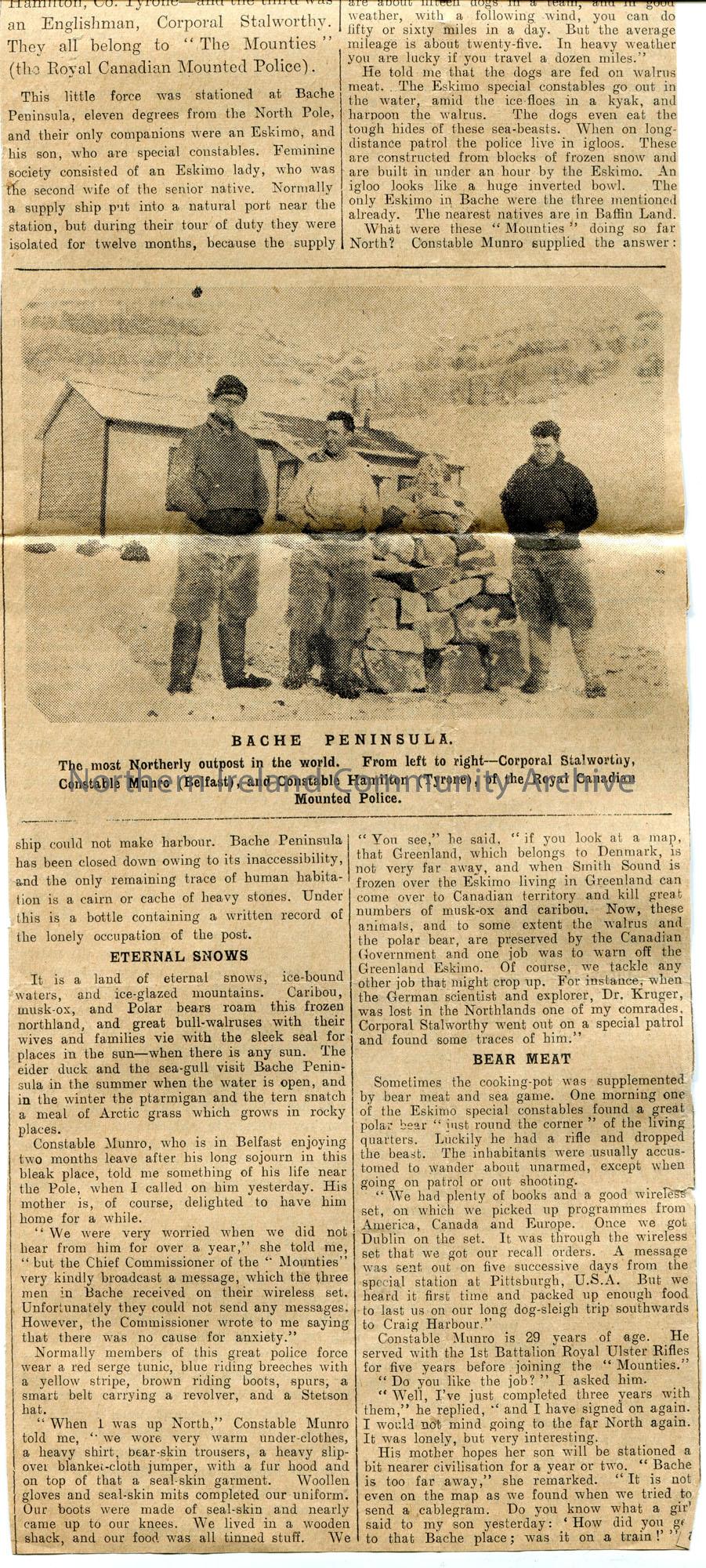Article cut from newspaper 'The Belfast Newsletter' titled, 'On the Top of the World. Belfastman's Experiences on a Lonely Canadian Patrol. Constable Munro of the "Mounties"'. Features a photographic image of Constable Munro, Belfast and Constable Hamilton, Tyrone, of the Royal Canadian Mounted Police.