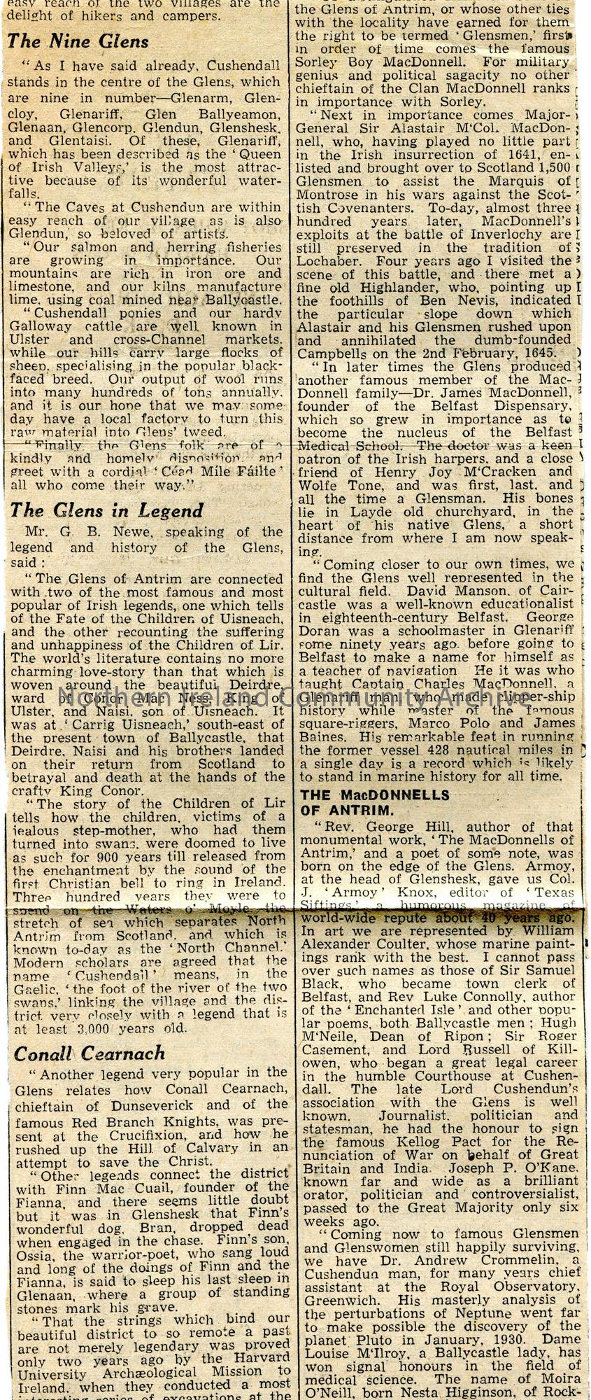 Article cut from newspaper titled, 'Cushendall On The Air'. The 'Provincial Journey' broadcast programme. Mentions Mr Arthur M'Alister, Mr G. B. Newe, Mr John McAuley, Rev. George Hill.