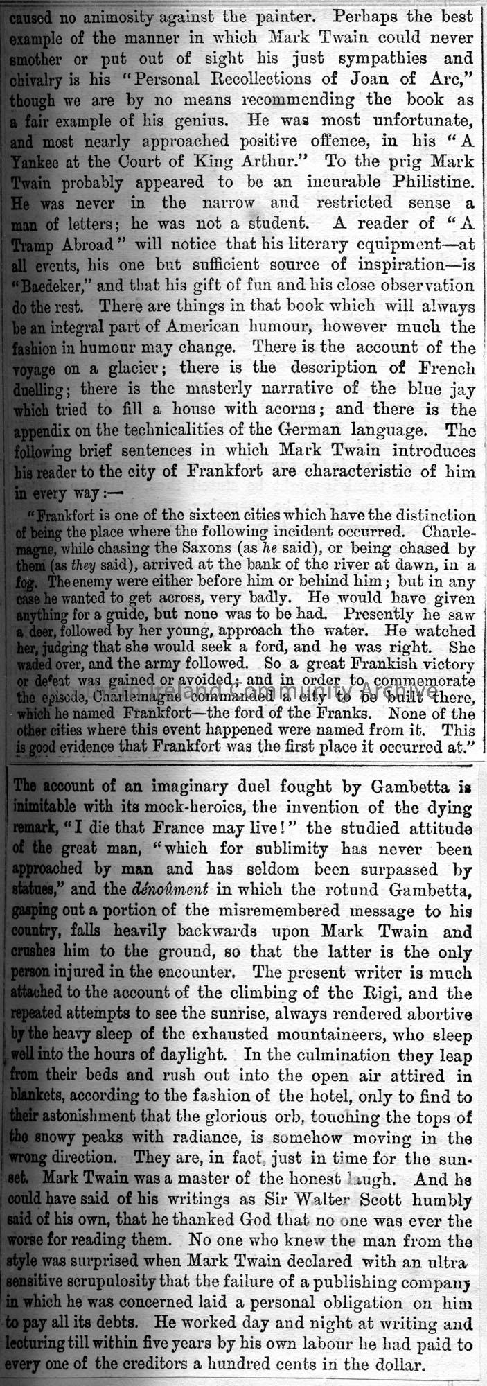 Article cut from newspaper titled, 'Mark Twain'. Dated April 1919 or 1910 (writing unclear).
