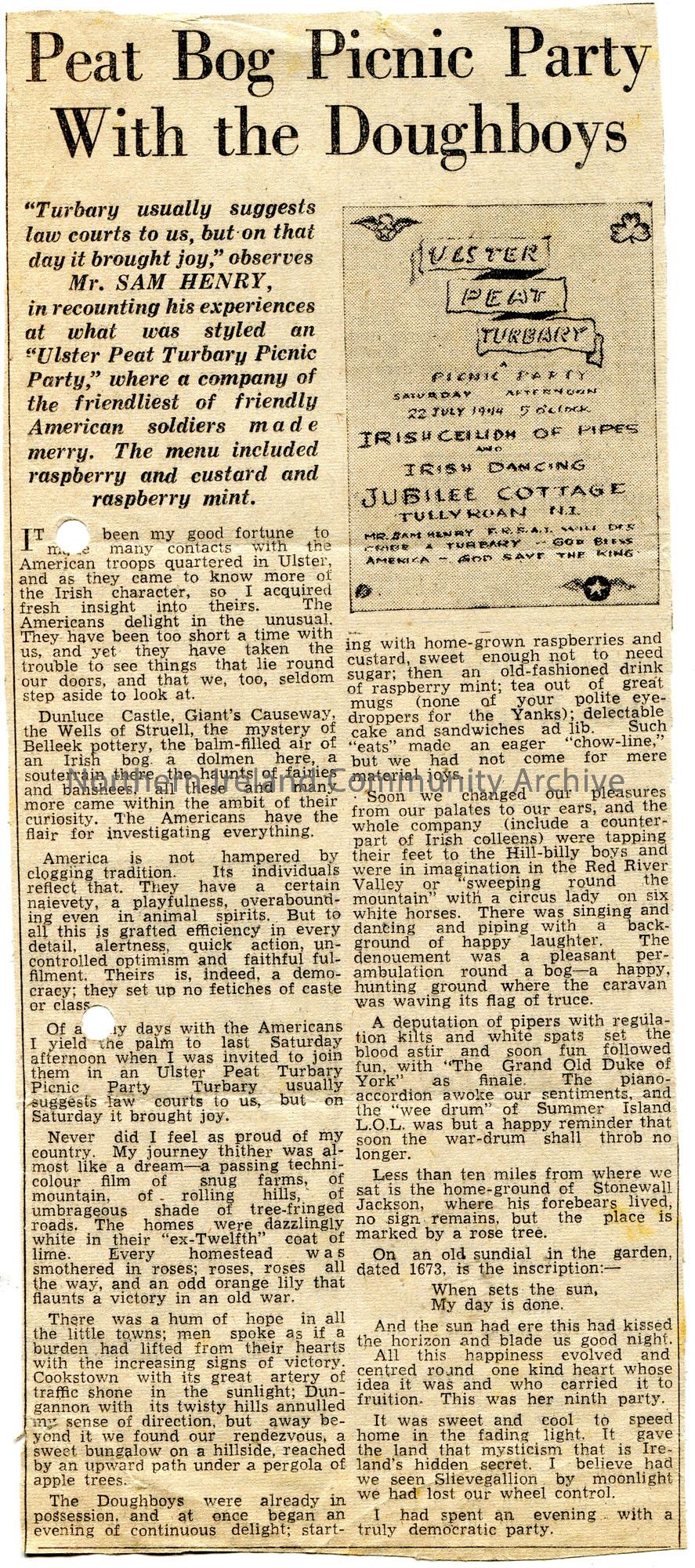 Article cut from newspaper titled, 'Peat Bog Picnic Party With the Doughboys'. An account from Sam Henry who attended the picnic party. The picnic was also attended by American troops who were stationed in Ulster.