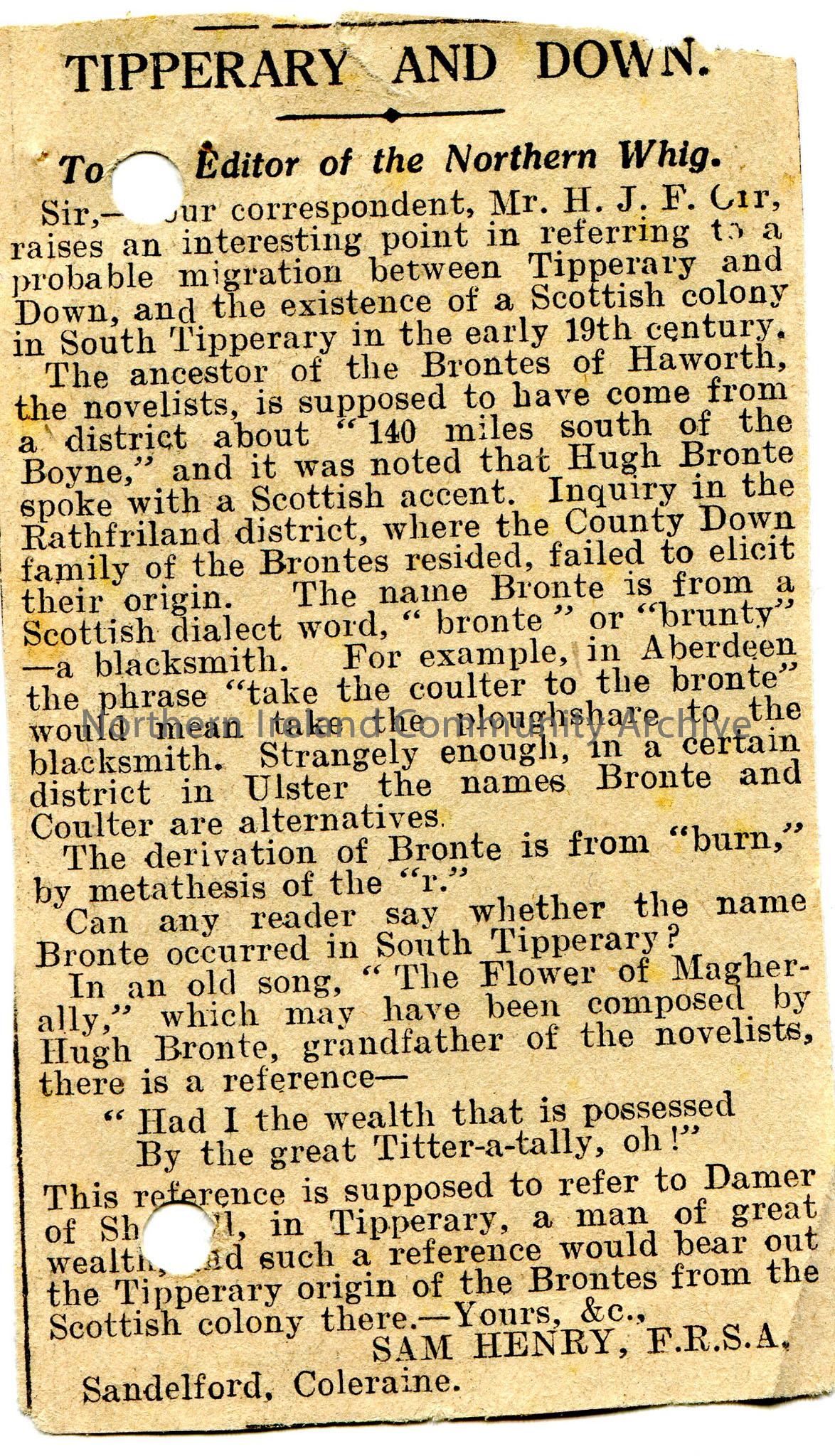 Article cut from newspaper titled, 'Tipperary and Down'. A letter sent into the Northern Whig newspaper by Sam Henry to the Editor. Sam is writing to enquire re a connection with Scotland and Tipperary. Refers to the Bronte family name. Asks readers if they know of any connection between the Bronte name and South Tipperary.