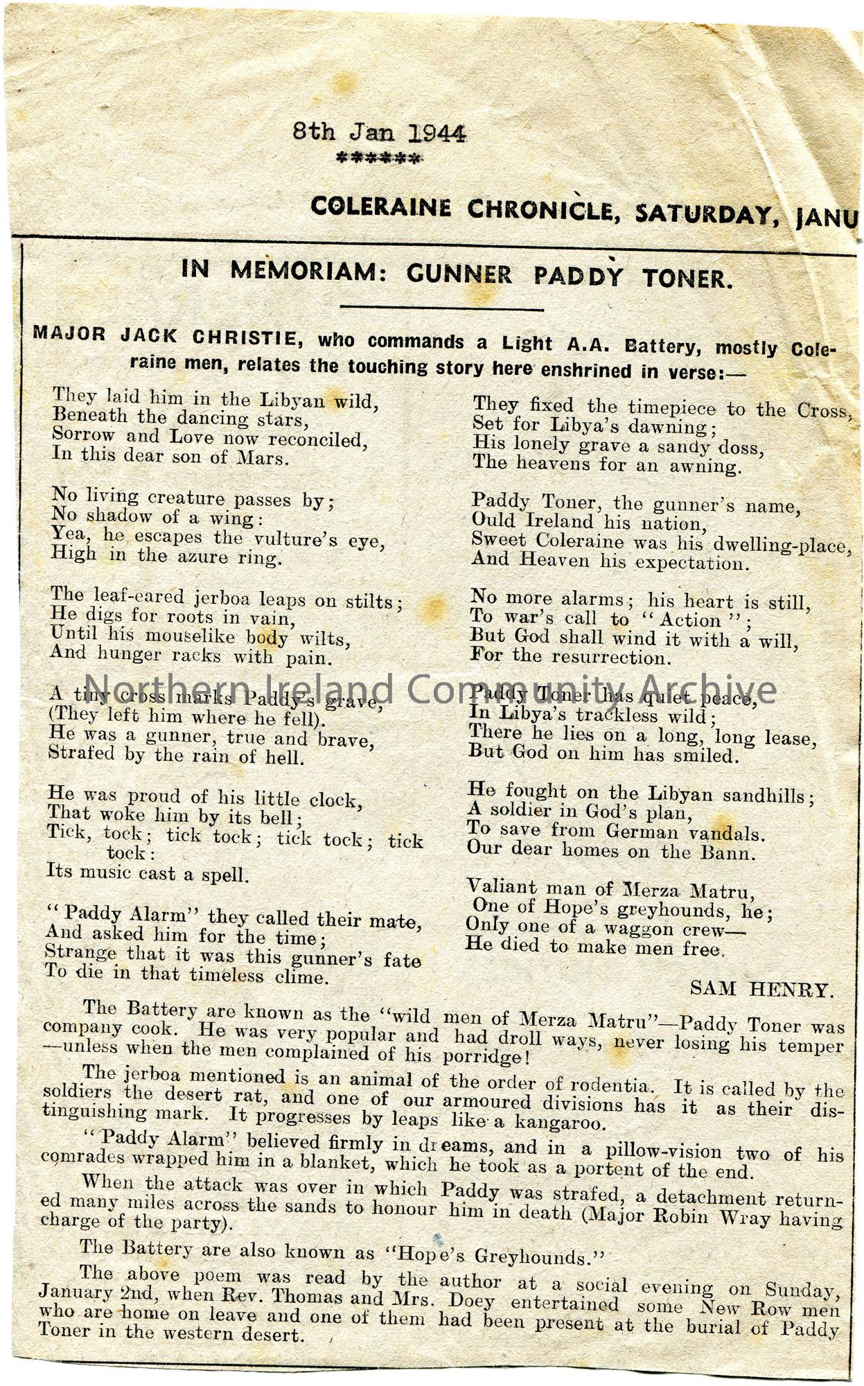 Article cut from the Coleraine Chronicle newspaper. A memoriam by Sam Henry for Gunner Paddy Toner. Includes poem by Major Jack Christie, commander of a Light A.A. Battery of mostly Coleraine men.
