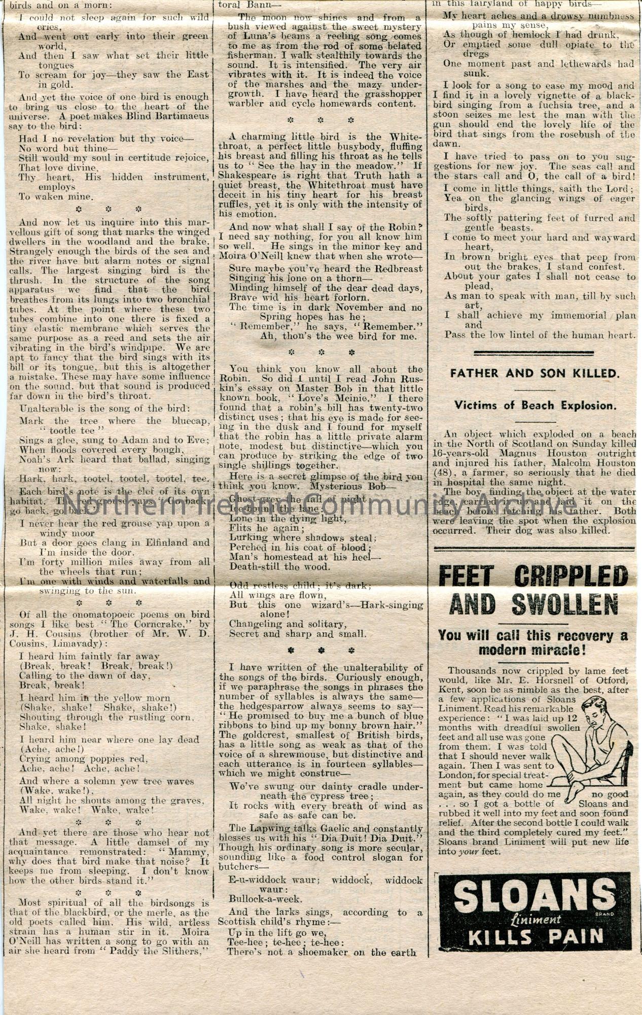 Article cut from the 'Coleraine Chronicle' newspaper of Saturday 1st March, 1941. Article written by Sam Henry titled, 'Spring is Coming! Listen to the Song of the Birds'. Re birdsong and poems re birdsong.