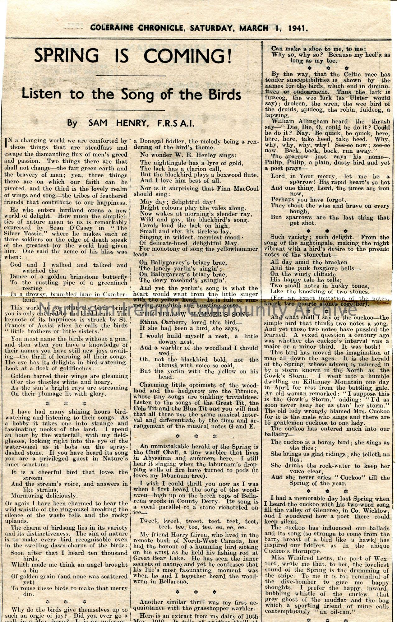 Article cut from the 'Coleraine Chronicle' newspaper of Saturday 1st March, 1941. Article written by Sam Henry titled, 'Spring is Coming! Listen to the Song of the Birds'. Re birdsong and poems re birdsong.