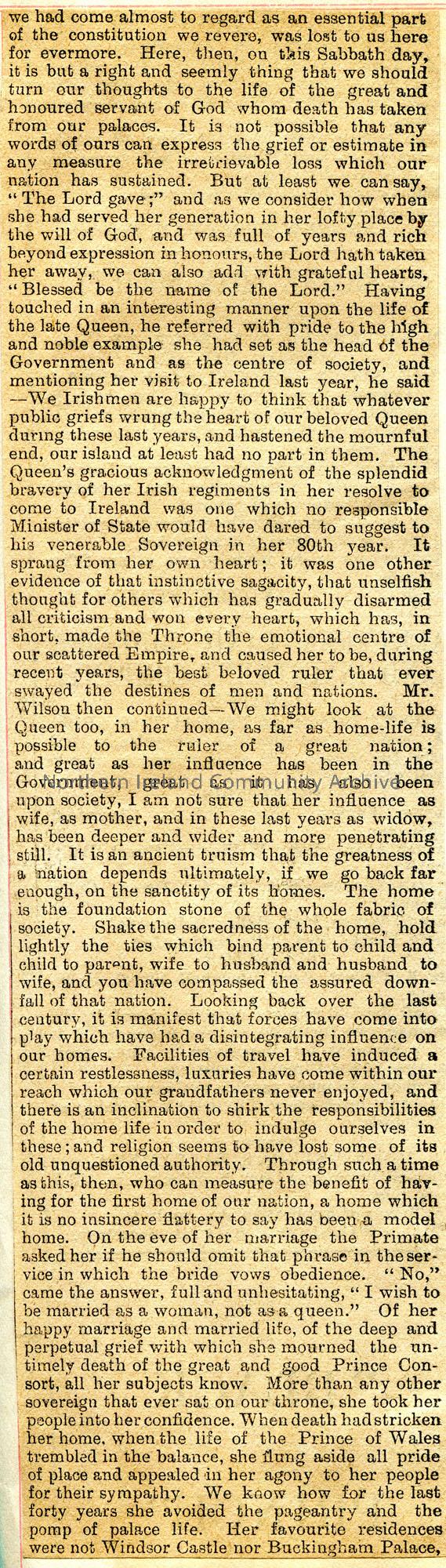Article cut from the Coleraine Chronicle newspaper titled, ‘New Row Presbyterian Church. Rev. W. A. Wilson, M.A.’ A sermon re the death of Queen Victo… – scan166b