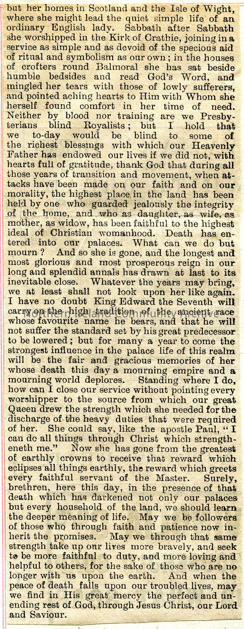 Article cut from the Coleraine Chronicle newspaper titled, 'New Row Presbyterian Church. Rev. W. A. Wilson, M.A.' A sermon re the death of Queen Victoria. 'Chronicle. Feb 2. 1901' handwritten in pencil below article.