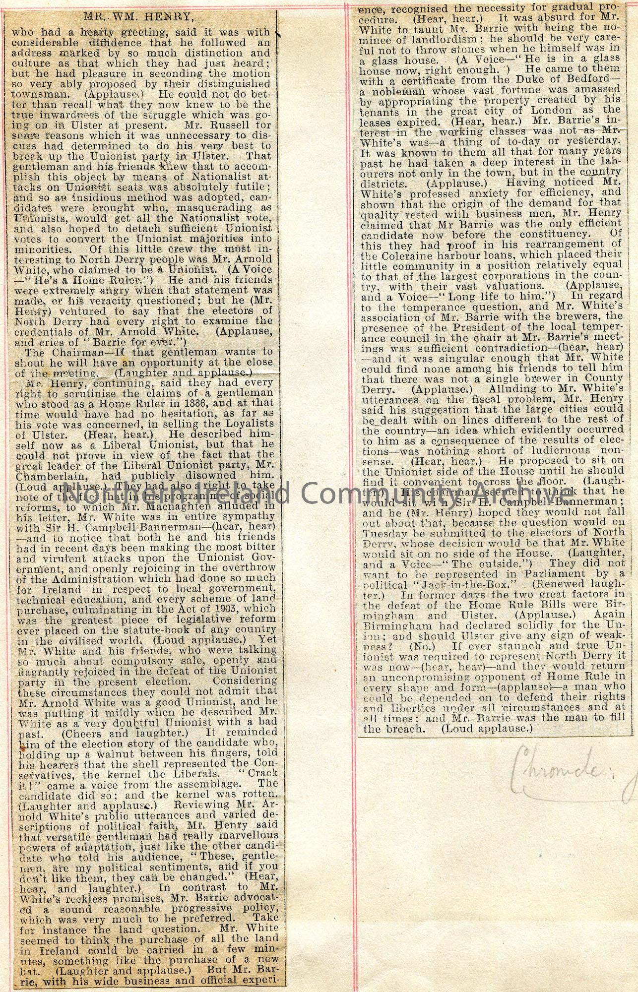 Article cut from the Coleraine Chronicle. Titled, ‘Mr WM Henry’. Re Home Rule. Captioned, ‘Chronicle. Jan 1906’.