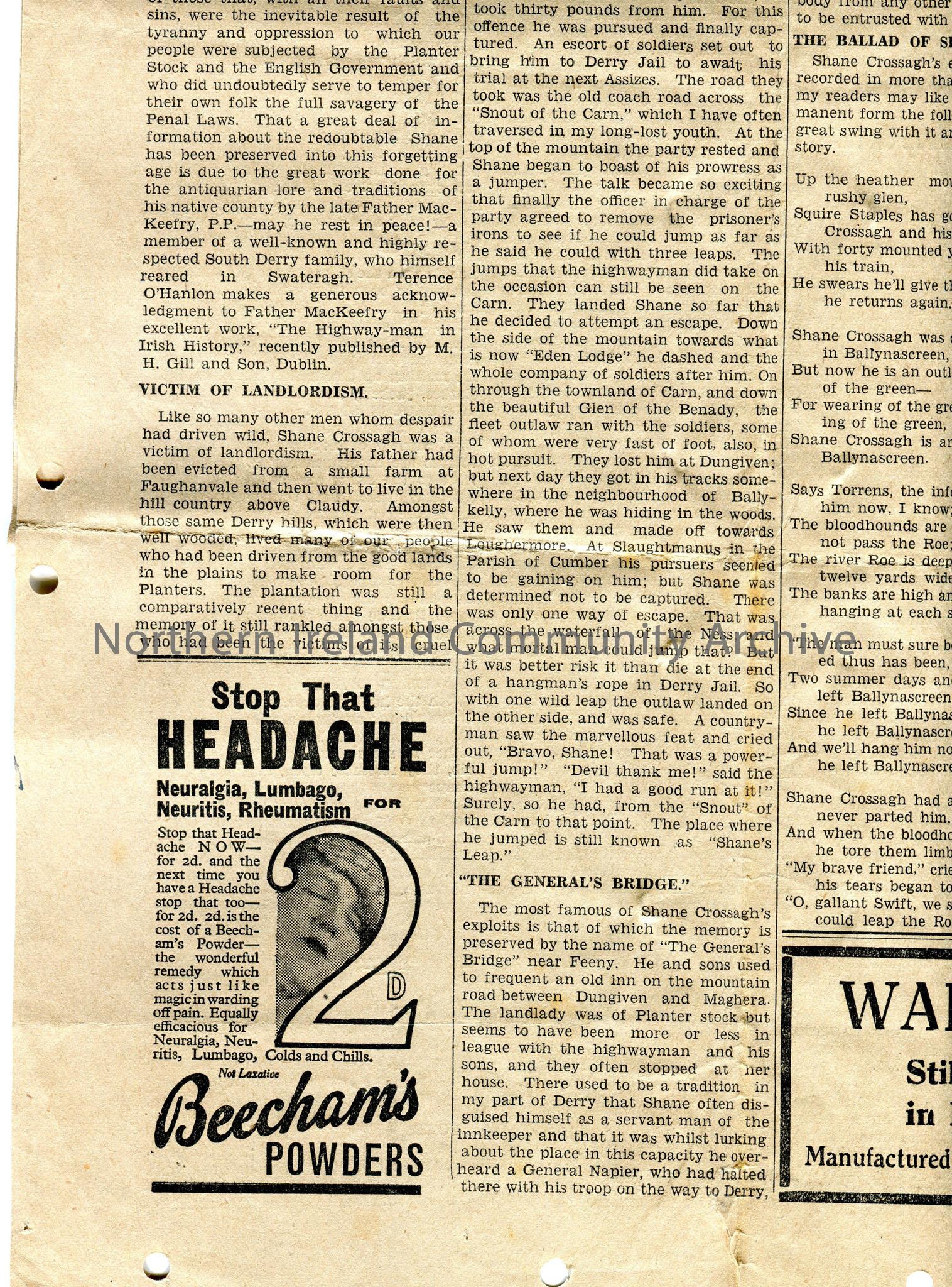 Article cut from the Derry Journal newspaper, dated 25th August, 1933, titled, 'Our Weekly Causerie "An Old Man#s Musings"'. Article by Cormac MacAirt re life and career of Shane Crossagh, rapparee from County Derry. Includes the ballad of Shane Crossagh.