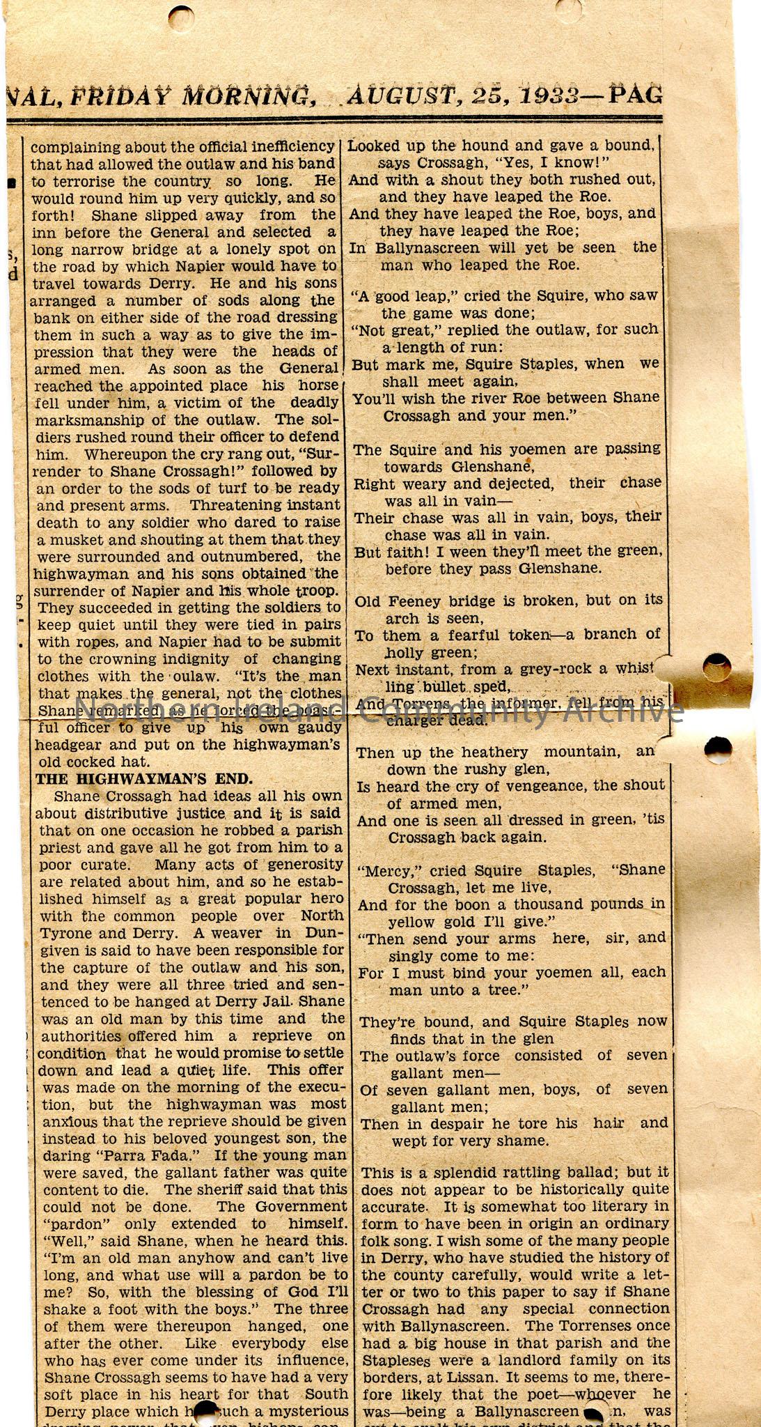 Article cut from the Derry Journal newspaper, dated 25th August, 1933, titled, 'Our Weekly Causerie "An Old Man#s Musings"'. Article by Cormac MacAirt re life and career of Shane Crossagh, rapparee from County Derry. Includes the ballad of Shane Crossagh.