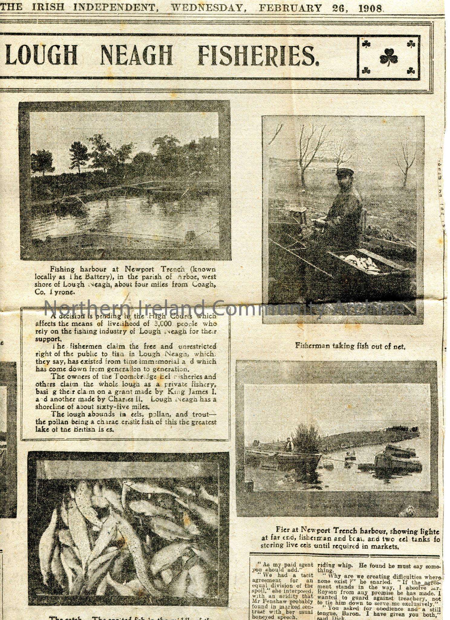 Article cut from The Irish Independent newspaper. Dated Wednesday 26th February, 1908. Titled, "The Lough Neagh Fisheries". Article re the access by the public to fish in Lough Neagh. The owners of the Toomebridge Eel Fisheries and others claim that it is privately owned. Includes six photographs of people, eels and area around the Lough.