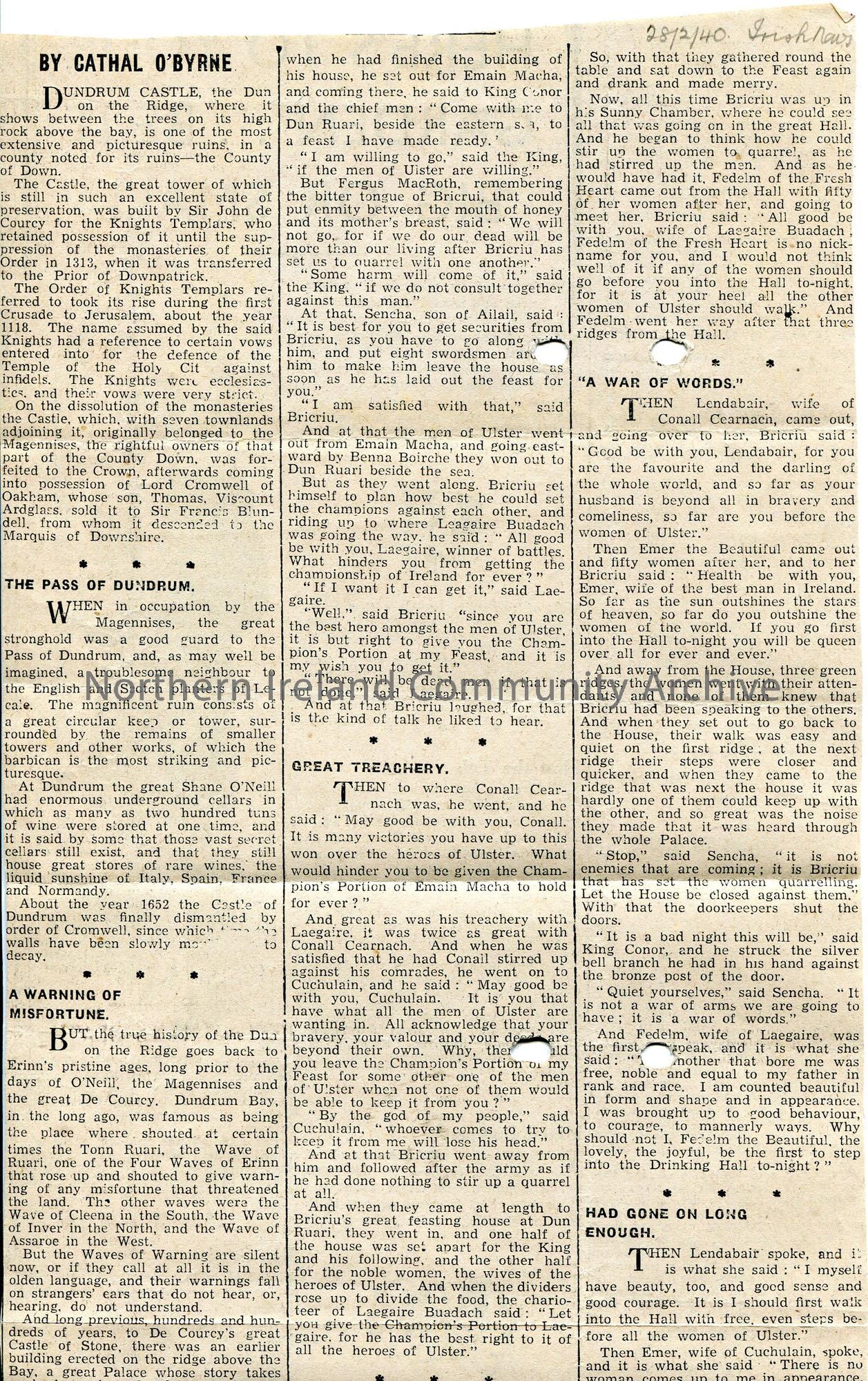 Article cut from the Irish News dated 28th February 1940. Article re Dundrum Castle by Cathal O'Byrne.