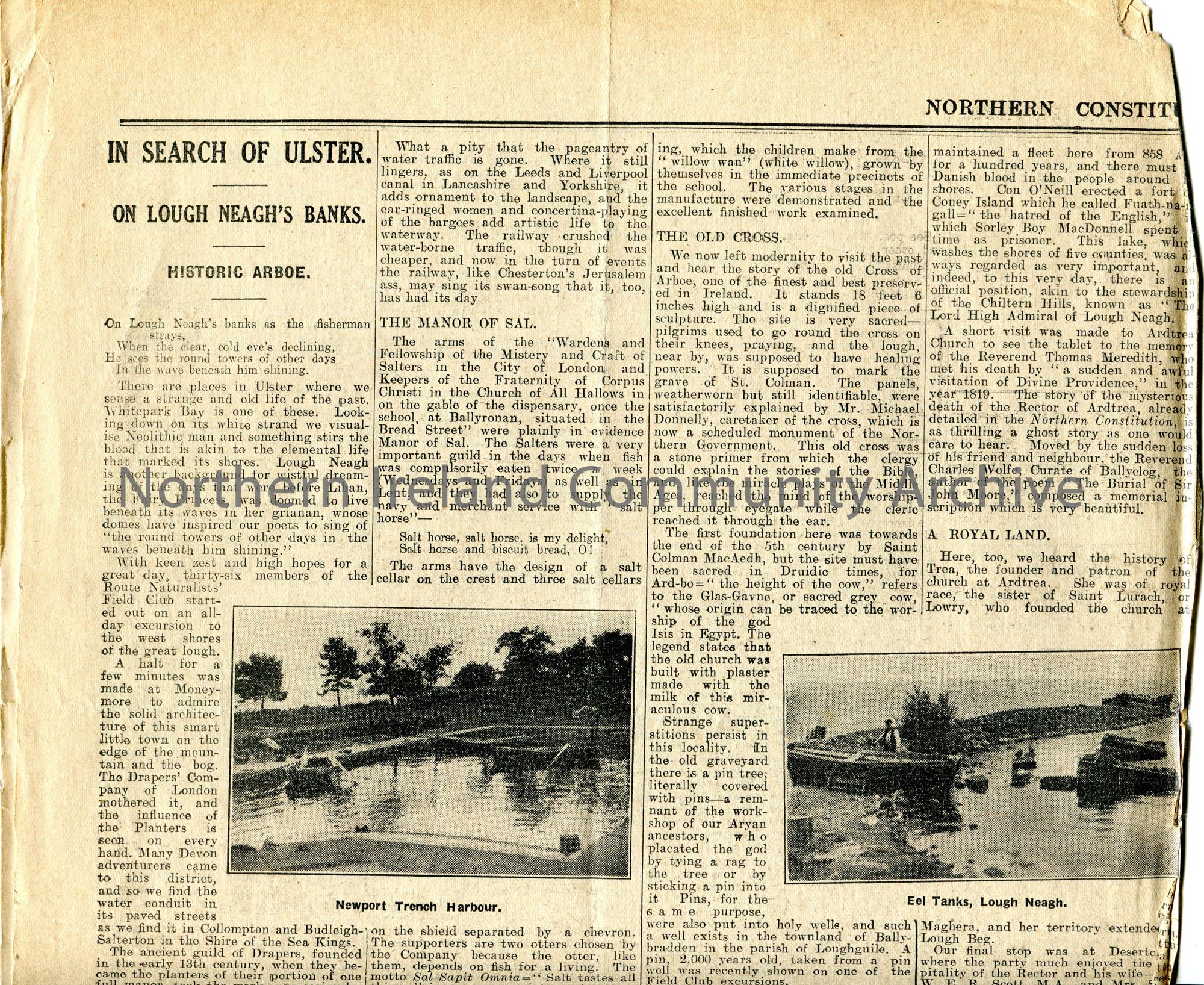 Article cut from the Northern Constitution newspaper, 24th June 1933. Features an article titled, 'In Search of Ulster. On Lough Neagh's Banks. Historic Arboe'. Re an excursion by 36 members of the Route Naturalists' Field Club. Four photographic images are featured in the article titled, 'Newport Trench Harbour', 'Eel Tanks, Lough Neagh', 'Salter's Castle', 'Baiting the Eel Lines at Kinturk', and 'Arboe Old Cross'.