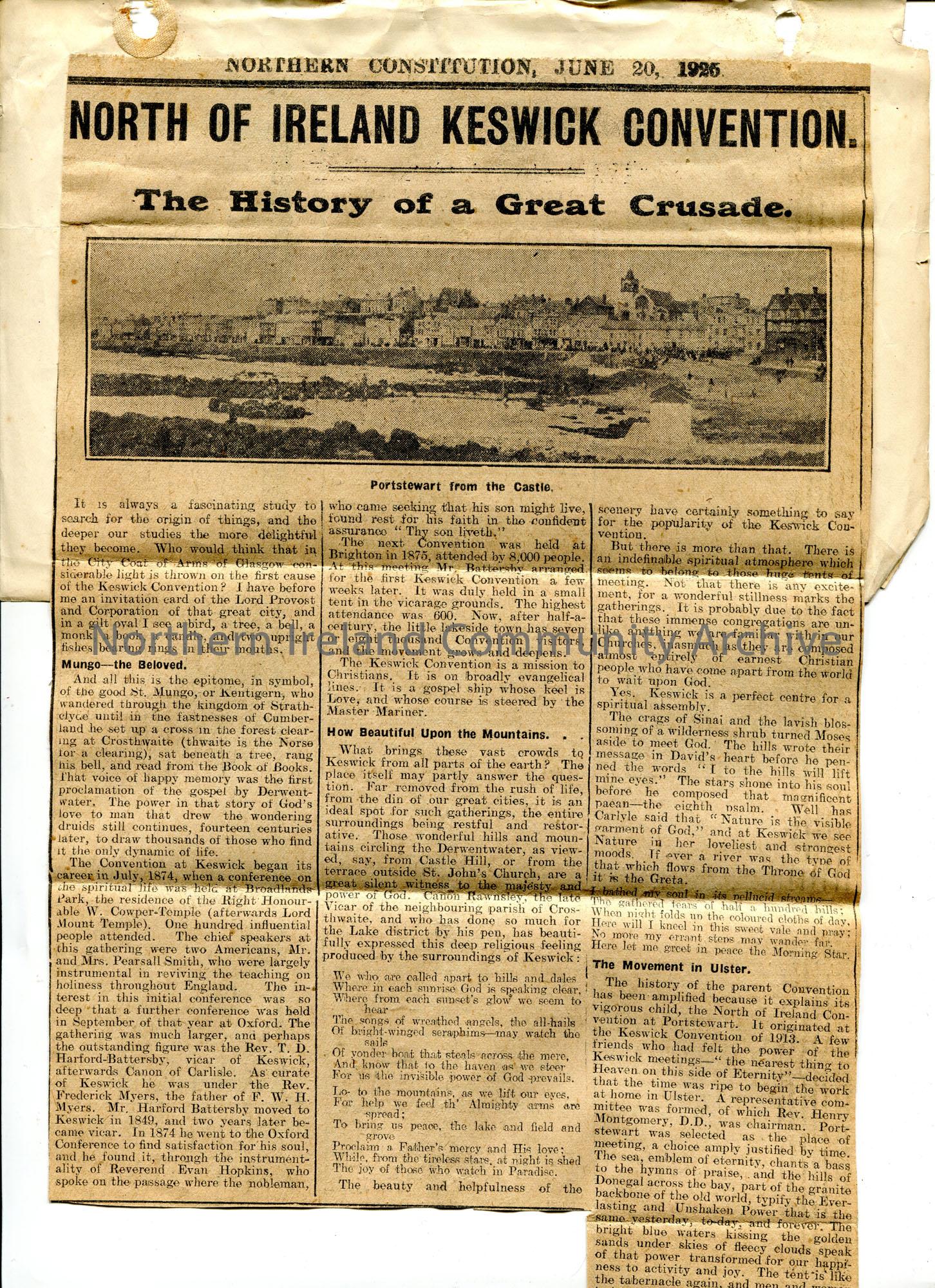 Article cut from the Northern Constitution newspaper and pasted to page. Titled, ‘North of Ireland Keswick Convention. The History of a Great Crusade’…