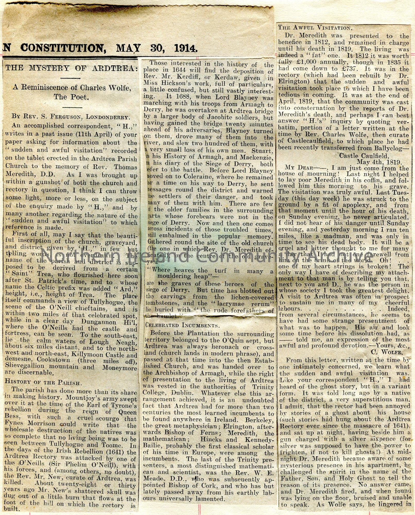 Article cut from the Northern Constitution newspaper. Dated 30th May 1914. Titled, 'The Mystery of Ardtrea: A Reminiscence of Charles Wolfe, The Poet'. By Rev. S. Ferguson, Londonderry.