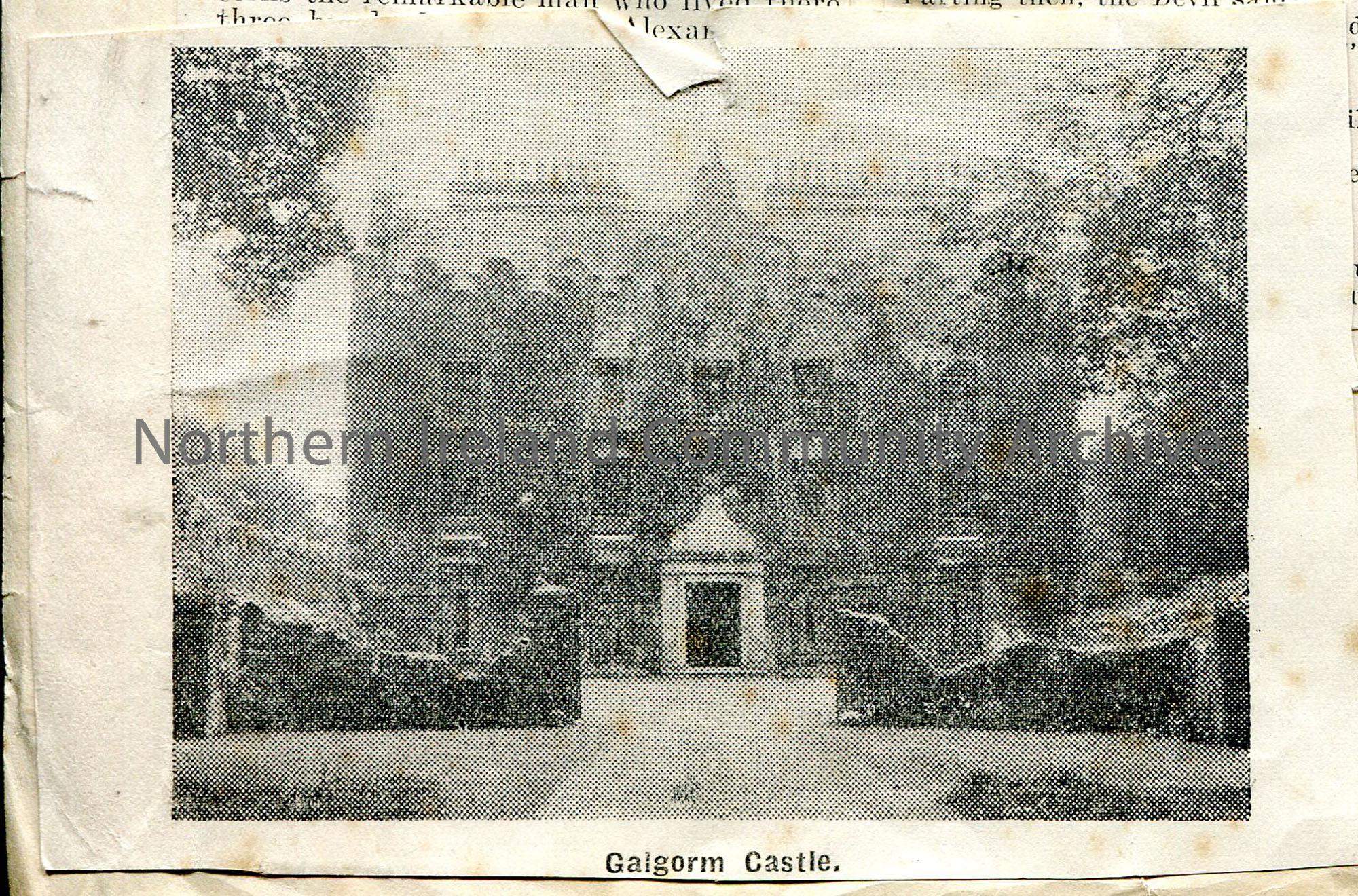 Article cut out and pasted to page with photographic image attached to page. Titled, 'Ghost of Galgorm. The Devil and the Doctor of Divinity. A Story of Seventeenth Century Black Magic'. Re Dr Colville, who built Galgorm Castle in 1640, and his association with the ghost of Galgorm Castle. Includes a ballad of the story titled 'The Romance of Colvin'.