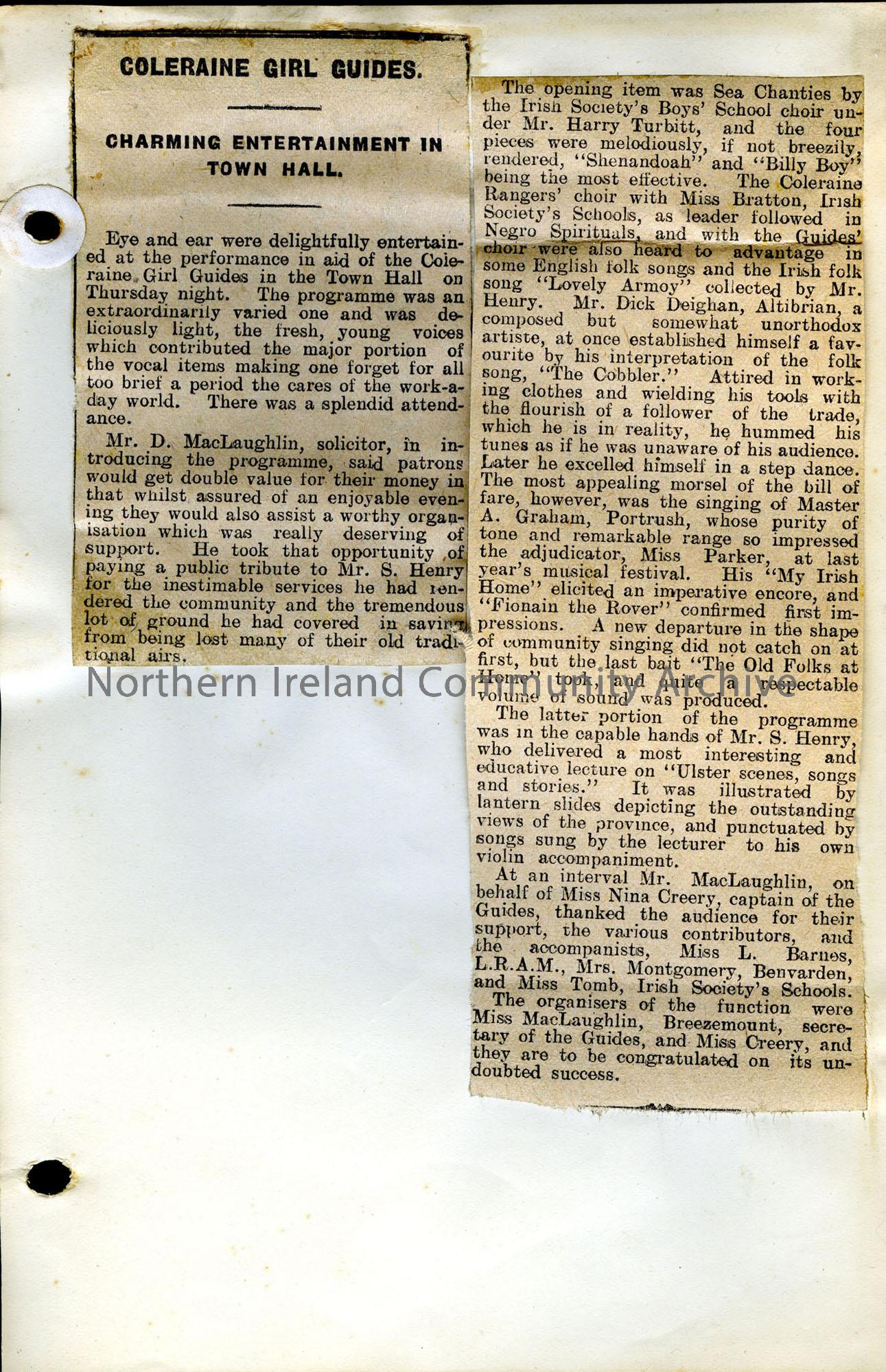 Article cut out and stuck to paper titled, 'Coleraine Girl Guides, Charming Entertainment in Town Hall'. Solicitor Mr. D. MacLaughlin introduced the programme. He paid thanks to Sam Henry for his work in the community.The Irish Society Boys' School choir under Mr. Harry Turbitt and Coleraine Rangers' Choir under Miss Bratton lead the event. Sam Henry gave a lecture on Ulster Scenes, Songs and Stories. The event was organised by Miss MacLaughlin, Breezemount and Miss Creery.
