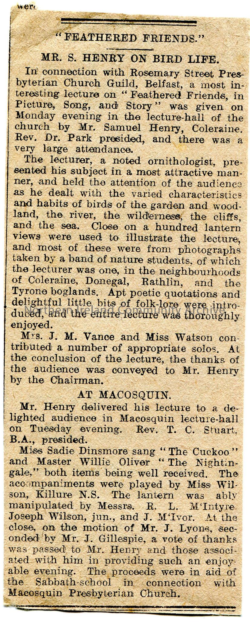 Article cut out from a newspaper. Titled, "Feathered Friends. Mr. S. Henry on Bird Life". Review of lecture in Rosemary Street Presbyterian Church Guild, Belfast by Sam Henry titled, "Feathered Friends, In Picture, Song and Story". Presided by Rev. Dr Park. Large attendance. Photographs on lantern slides had been taken by nature students and Sam Henry himself in the Coleriane , Donegal, Rathlin and Tyrone areas. Solos were performed by Mrs. J. M. Vance and Miss Watson. Article also includes review of the same lecture in Macosquin lecture hall, Tuesday evening. Presided by Rev. T. C. Stuart. Miss Sadie Dinsmore sang "The Cuckoo" and Master Willie Oliver "The Nightingale. Accompaniments by Miss Wilson, Killure N.S. Lantern slides were operated by Mr R. L. M'Intyre, Mr Joseph Wilson, jun., and Mr J Gillespie.