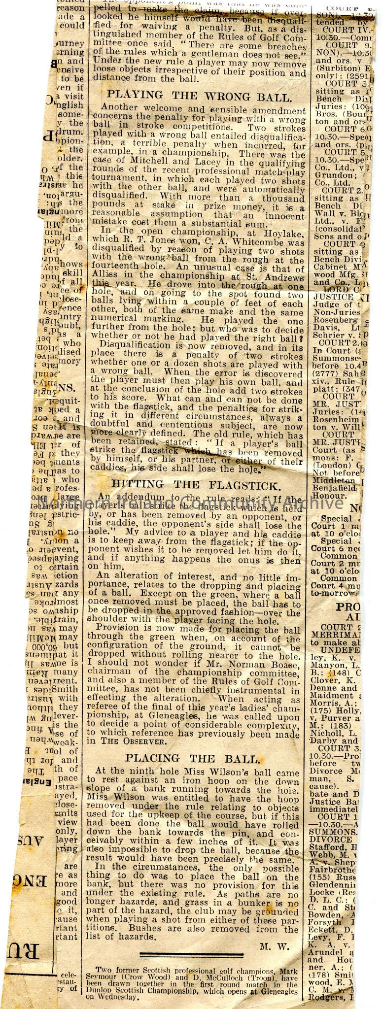 Article cut out from a newspaper titled, 'Golf. Breaches of Rules. New Penalties. The Wrong Ball-Two Strokes. Pathways Not Hazards'. Article by M.W re the new rule of golf. Writes that the rule are now simple and less confusing. Discusses the new rules which are to come into force on 1st January. Writes that Mr Norman Boase, chairman of the championship committee and member of the Rules of Golf Committee, has no doubt been involved in the changes.