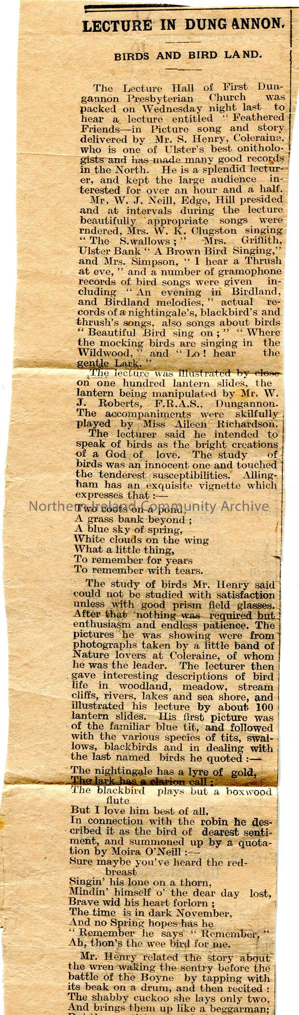 Article cut out from a newspaper. Titled, "Lecture In Dungannon. Birds and Bird Land". Review of lecture by Sam Henry titled, "Feathered Friends. In Picture, Song and Story", held at First Dungannon Presbyterian Church with a 'large audience'. Mr W. J. Neill presided. "The Swallows" was sung by Mrs. W. K. Clugston; "A Brown Bird Singing" sung by Mrs Griffith, Ulster Bank; and "I hear a Thrush at eve" by Mrs Simpson. Other songs included, "Beautiful Bird Sing On", "Where the Mockingbirds are Singing in the Wildwood" and "Lo! Hear the Gentle Lark". Close to one hundred slides were used, operated by Mr W. J. Roberts, F.R.A.S., Dungannon. Article gives description of what was talked about in the lecture and includes quotes from Sam Henry and Moira O'Neill.