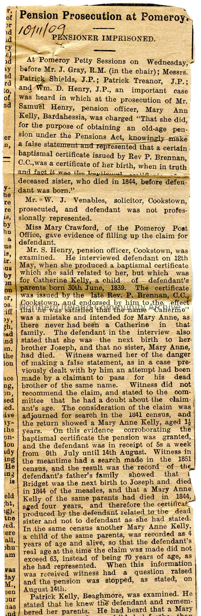 Article cutting from a newspaper. Date of 10th November 1909 handwritten at top of page. Article titled, 'Pension Prosecution at Pomeroy. Pensioner Imprisoned'. Mary Ann Kelly of Bardahessia was charged with falsifying a document which entitled her to an Old Age Pension. Sam Henry was present at witness. She was charged to 14 days imprisonment in Derry Jail.