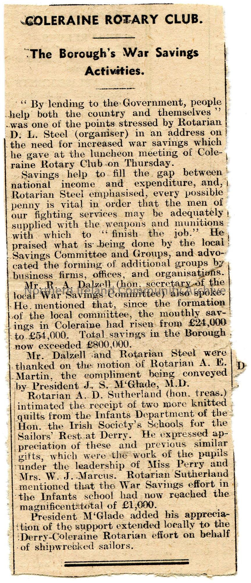 Article cutting from a newspaper. Titled, 'Coleraine Rotary Club. The Borough's War Savings Activities'. Address by Rotarian D. L. Steel at a meeting of Coleraine Rotary Club emphasising the need for increased war savings. The Borough has saved a total of £800,000.