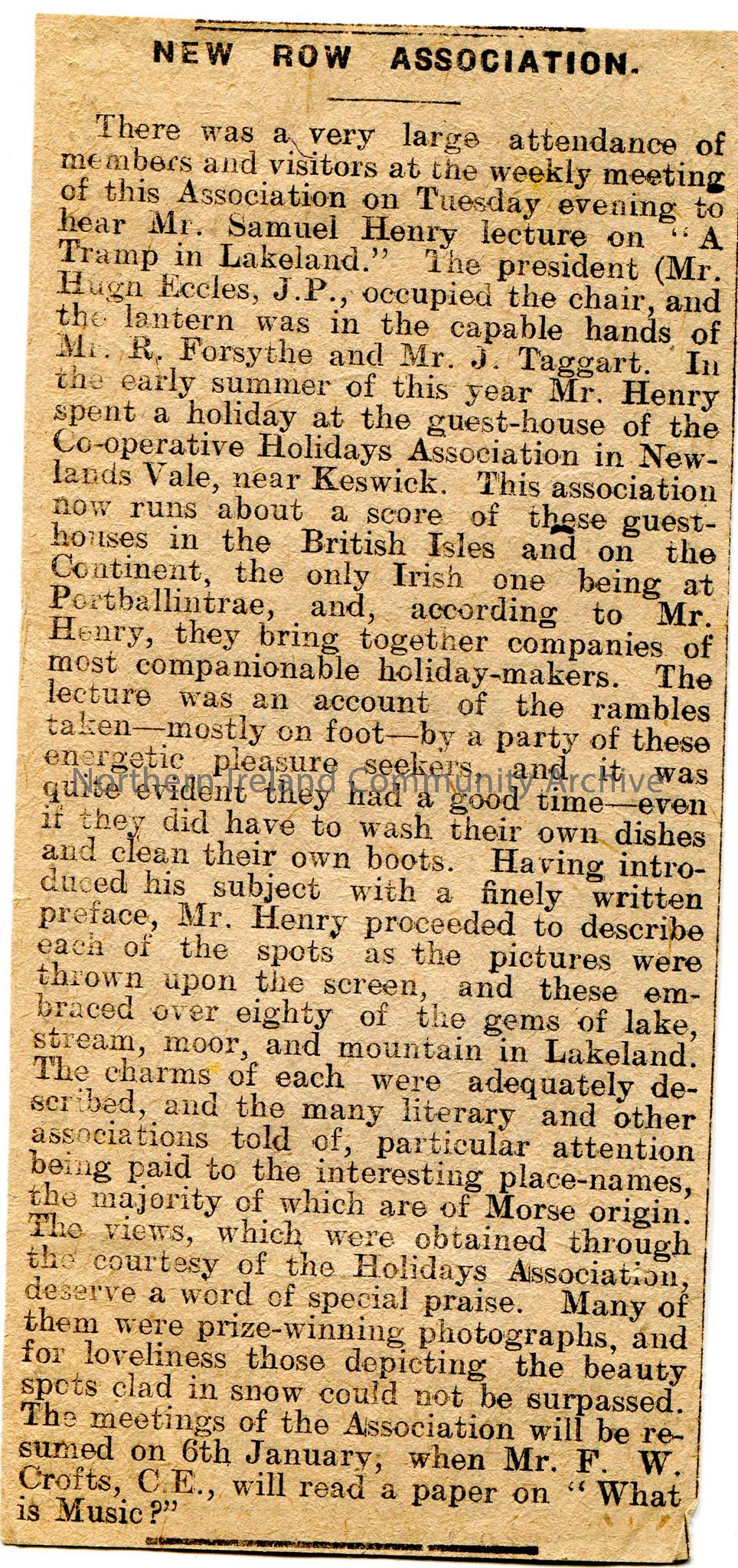 Article cutting from a newspaper titled, 'New Row Association'. Re weekly meeting of the Association. Lecture by Sam Henry on 'A Tramp In Lakeland'. Included lantern slides.