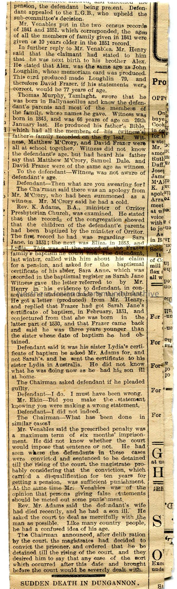 Article cutting from 'The Mid-Ulster Mail' newspaper titled, 'Cookstown Old-Age Pensioner Prosecuted'. Re prosecution of David Frazer of Orritor for falsifying a claim for the old-age pension. Sam Henry was involved with the case as witness.