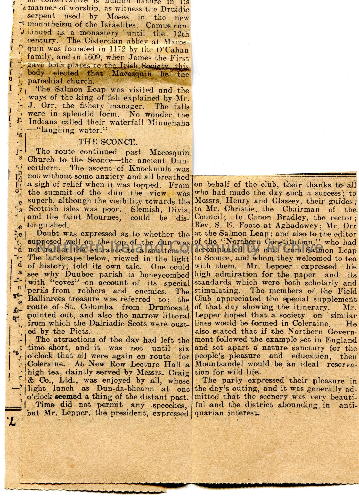 Article cutting from the 'Northern Constitution' newspaper titled, 'Belfast Naturalists. Visit to Coleraine District. Delightful Field Excursion'. 40 members attended the trip. They were met in the Town Hall by Mr D. H. Christie. They visitied St. Patrick's Church, Mountsandel, Aghadowey, Camus graveyard, the Salmon Leap and the Sconce - Dunceithern. The day finished with tea in New Row Lecture Hall. Sam Henry was thanked for acting as a guide.