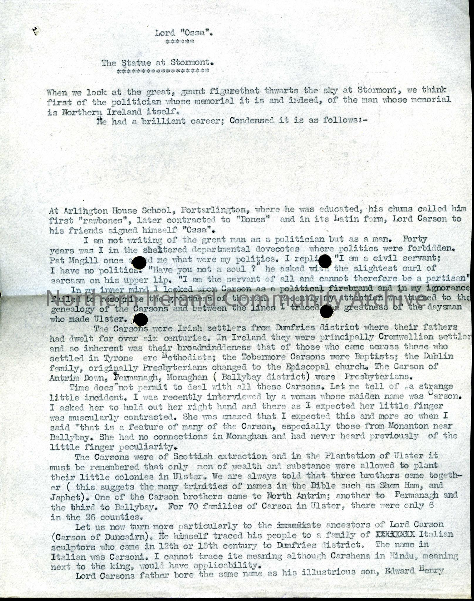 Article entitled “Lord Ossa.” – An appreciation of Lord Edward Carson and some insight into his genealogy and into that of Carsons in Ireland generall…