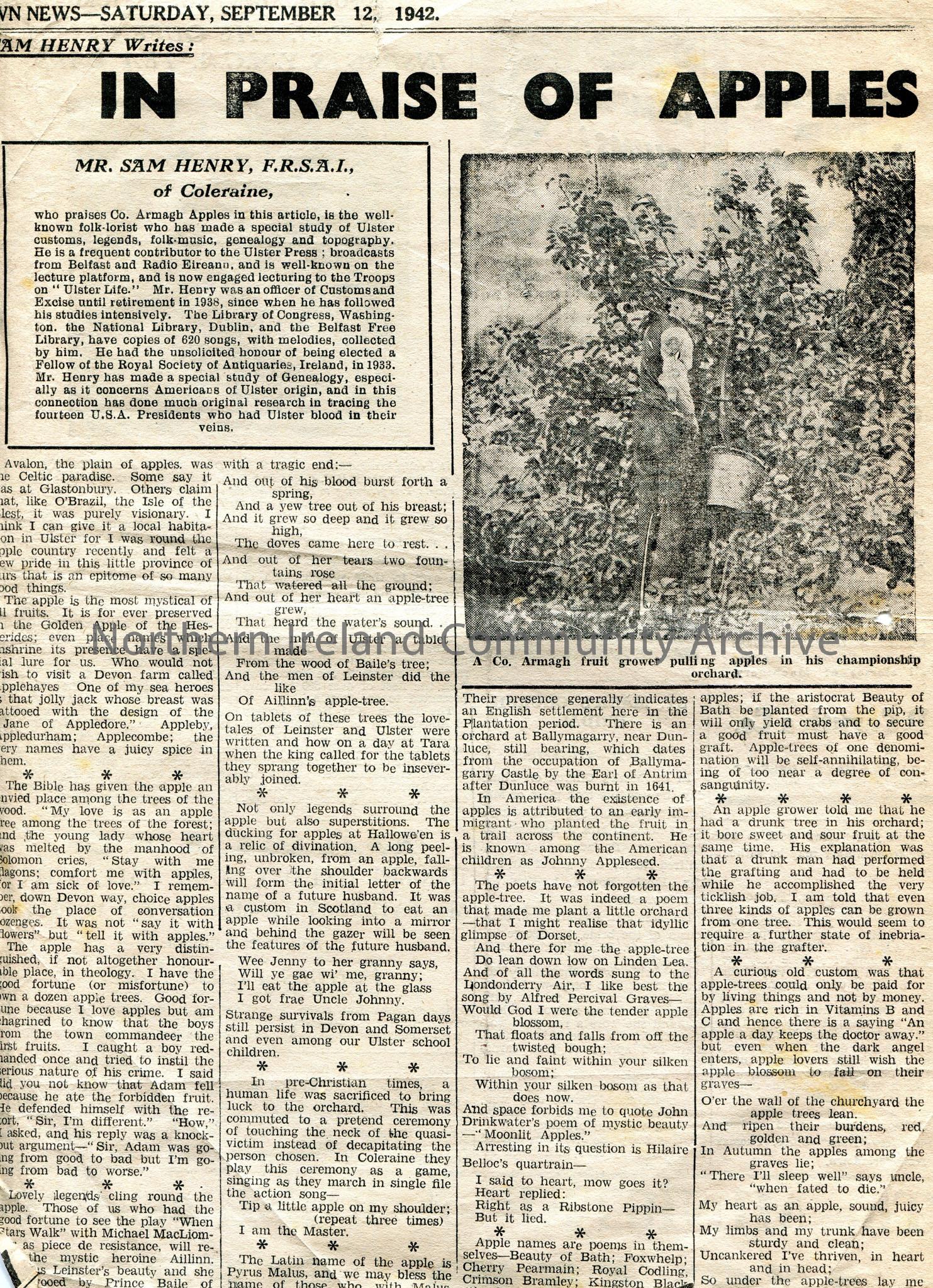 Article from a page in the Portadown News. Dated Saturday 12th September, 1942. Article by Sam Henry titled, "In Praise of Apples". Article re the apples of Co. Armagh. Includes photographic image of Co.Armagh fruit grower.