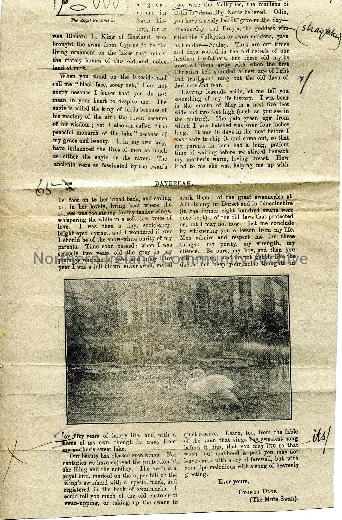Article from 'Daybreak' publication titled, 'Letters from Bird Friends'. Written by Sam Henry from the viewpoint of a swan. Features photographic image of swans by a lake. Annotated in ink for changes to be made.