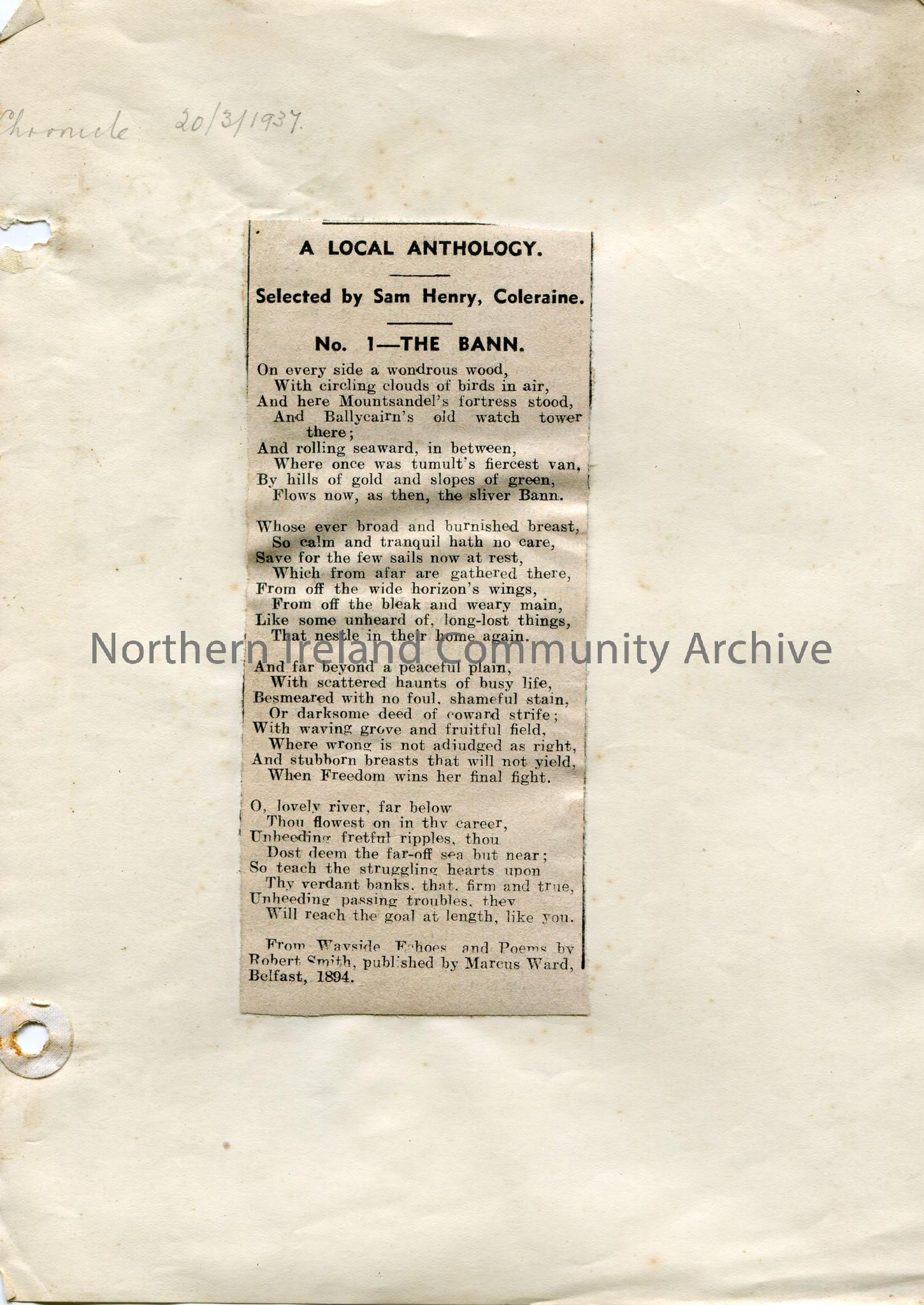 Article of a poem or words to song from the 'Chronicle' newspaper cut out and stuck to paper. 'Chronicle 20/3/1937' handwritten in pencil at top of page. Article titled, 'A Local Anthology. Selected by Sam Henry, Coleraine. No. 1 - The Bann'. From Wayside Echoes and Poems by Robert Smith, published by Marcus Ward, Belfast, 1894.