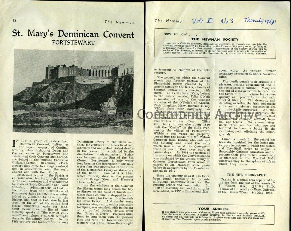 Article on St Mary's Dominican Convent, Portstewart in the Newman Vol 6 No.3 Trinity 1953