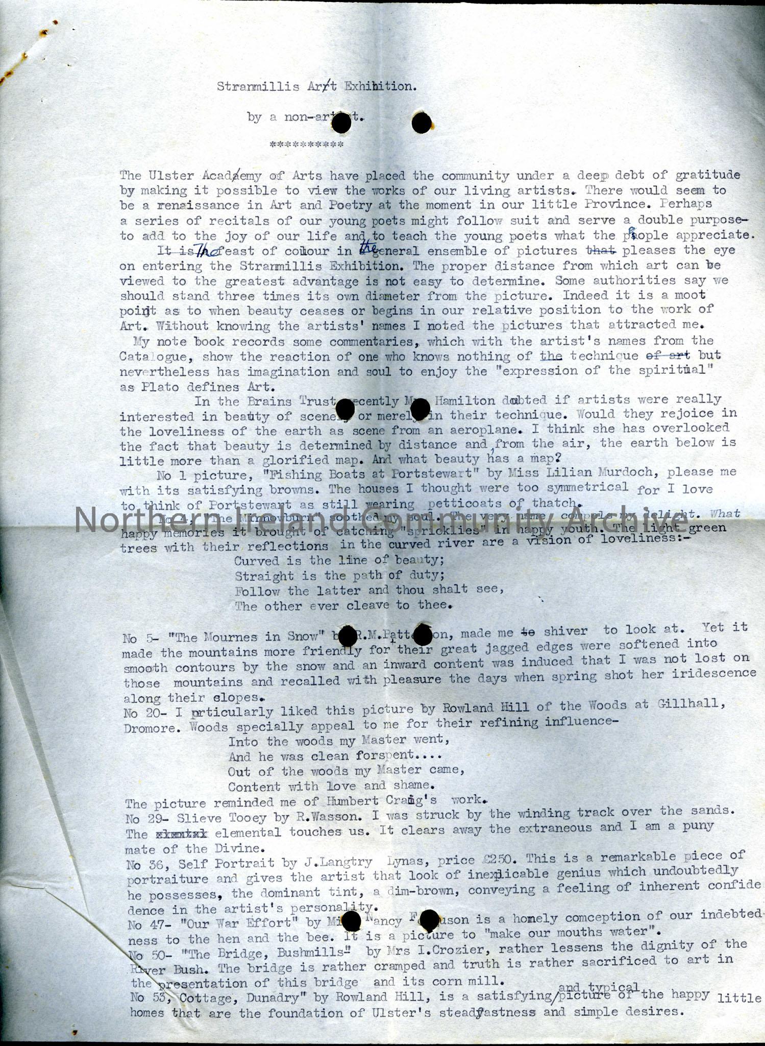 Article on the Stranmillis Art Exhibition of 1942.