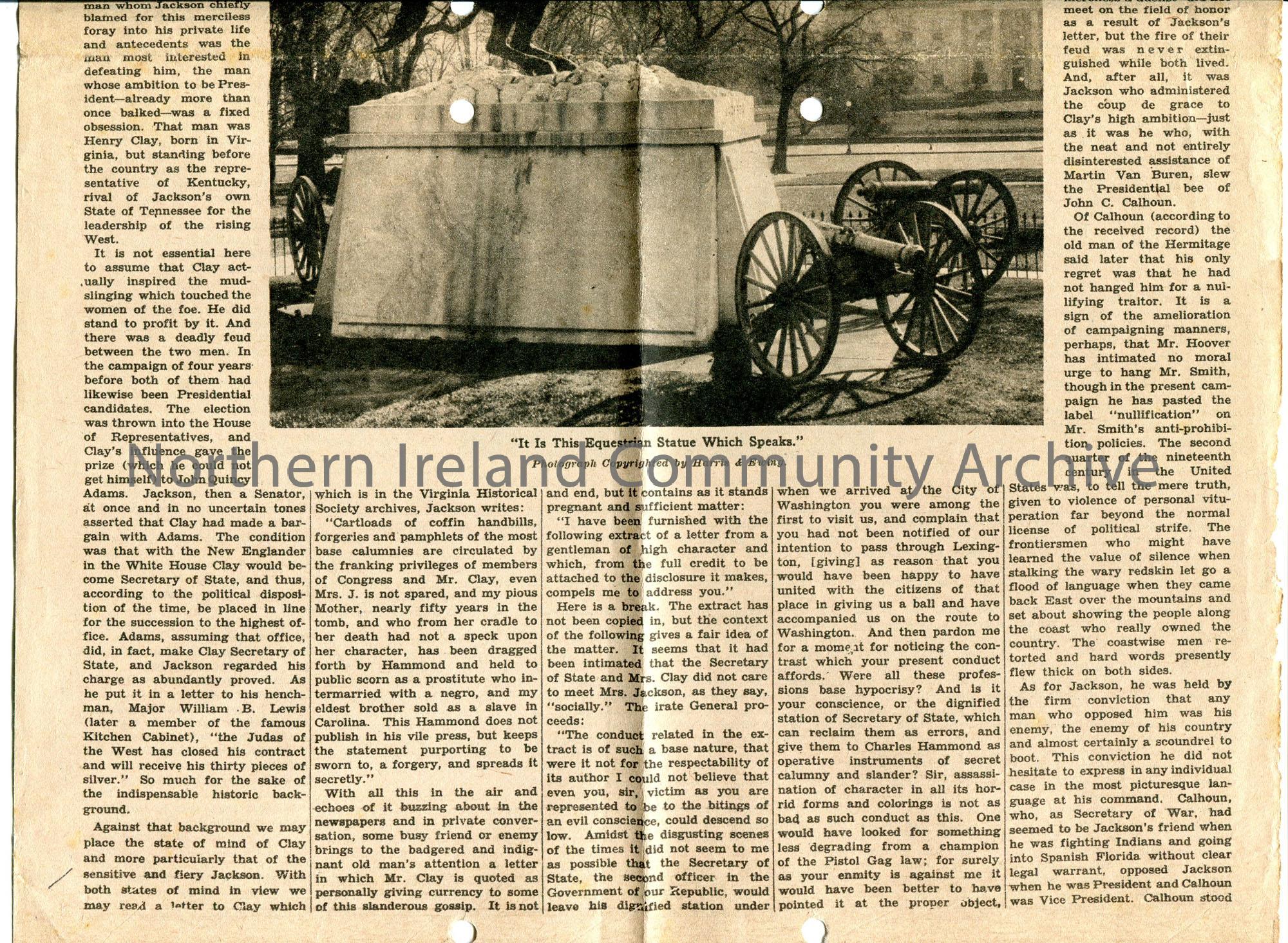 Article taken from 'The New York Times Magazine'. Dated 28th October, 1928. Titled, 'Jackson's Long-Hidden Rebuke to Clay'. Re unpublished letters of Andrew Jackson. Article by H I Brock. Photographic image in middle of article captioned, 'It Is This Equestrian Statue Which Speaks'. Image of a man on the back of a horse.