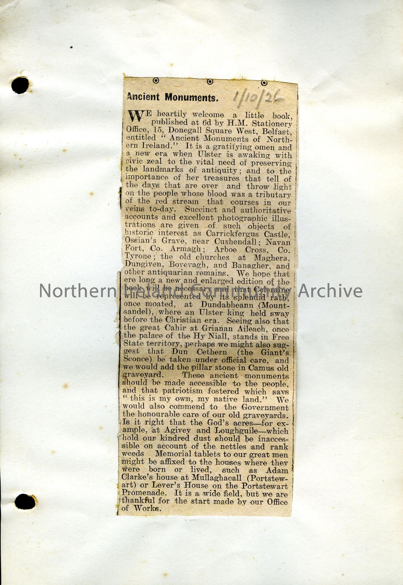 article titled, ‘Ancient Monuments’. Dated 1.10.26. Details of a book published ‘Ancient Monuments of Northern Ireland’. Landmarks include Carrickferg…