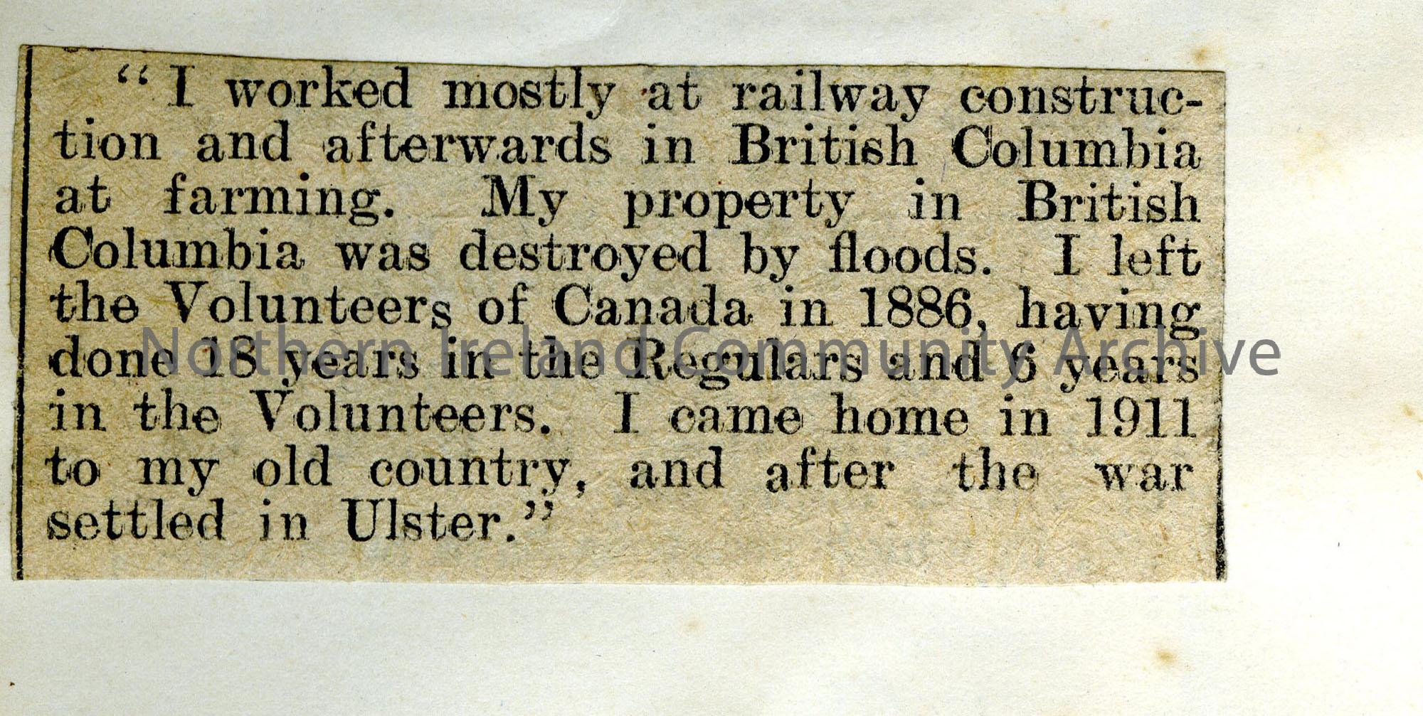 article titled, ‘James Hewitt, Only Surviving Crimean Veteran In Ulster’, the article details Hewitt’s time in the army until his settlement in Ulster… – Scan 009b