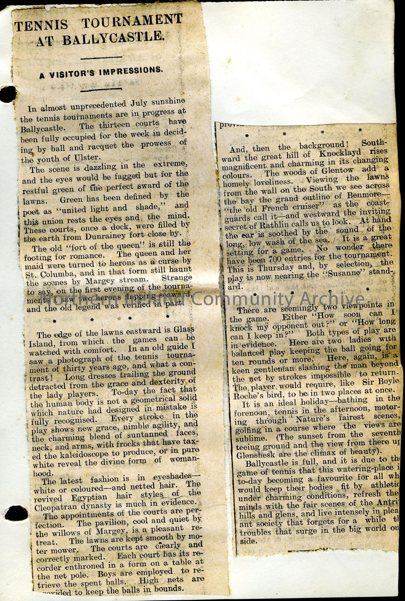 article titled, ‘Tennis Tournament At Ballycastle, A Visitor’s Impressions’.