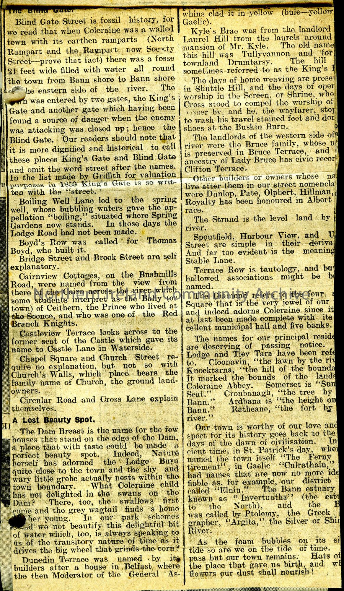 article titled ‘The Street Names of Coleraine, An Outline for Philosophical Postmen’. The origins of the street names in Coleraine are discussed such … – Scan 005c
