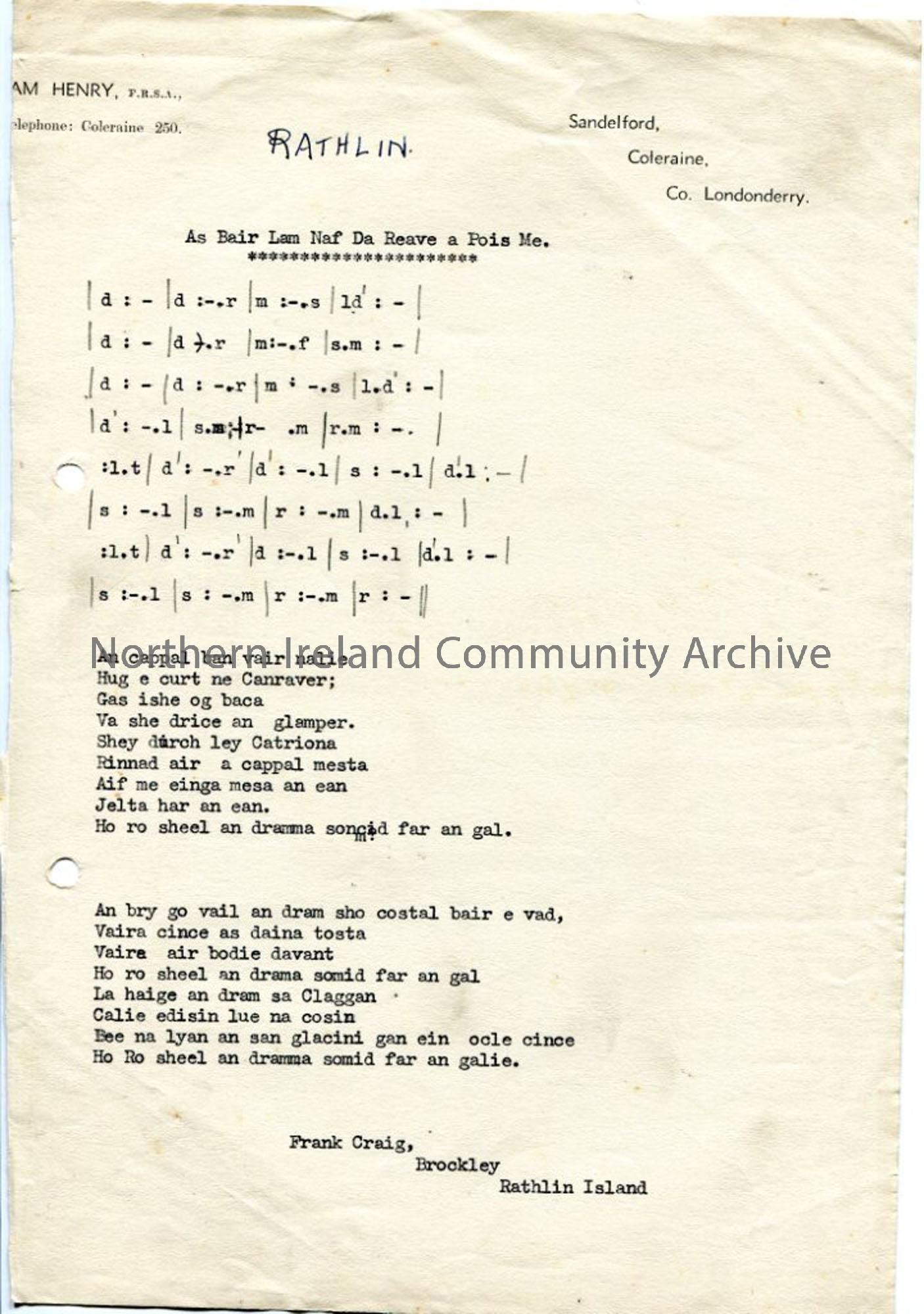 Tags: folksong, Gaelic, Rathlin, song collecting