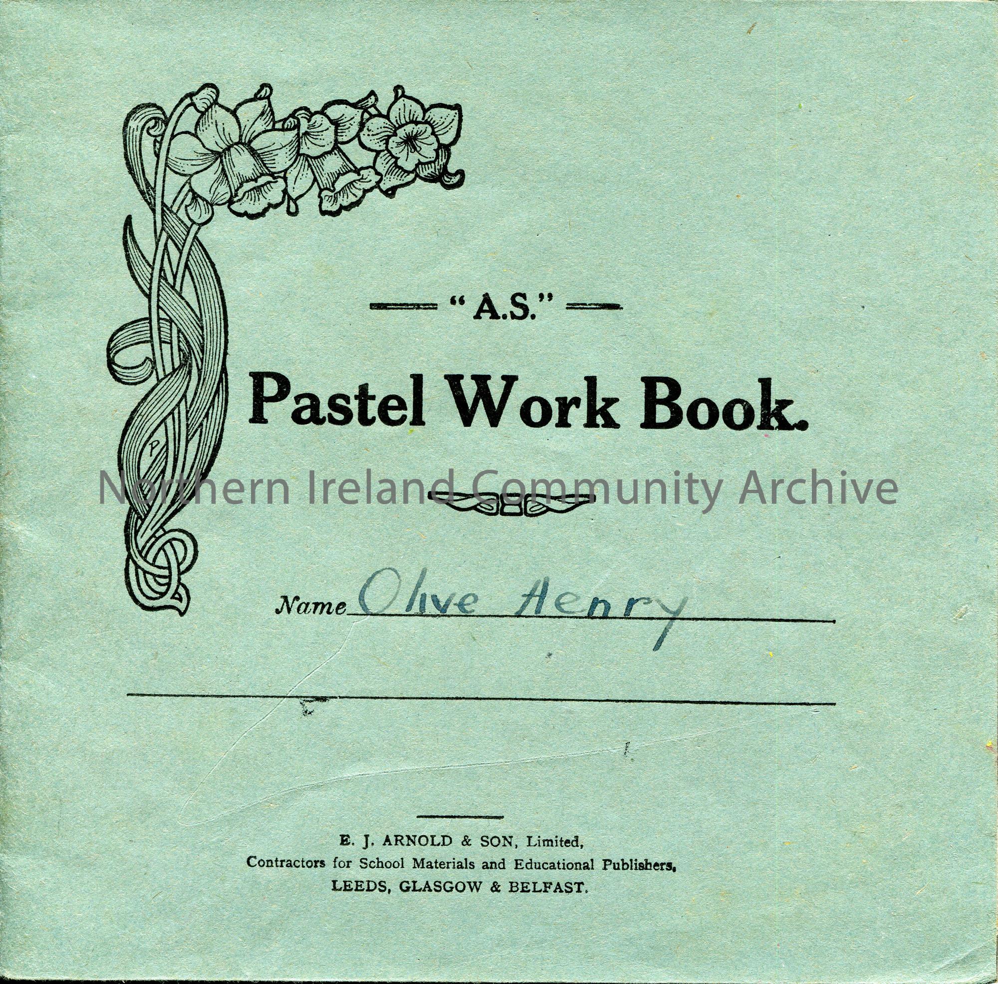 “A.S.” Pastel work book belonging to Olive Henry. Her name is handwritten on the front cover. Decorative image of daffodils printed on front cover. Co…