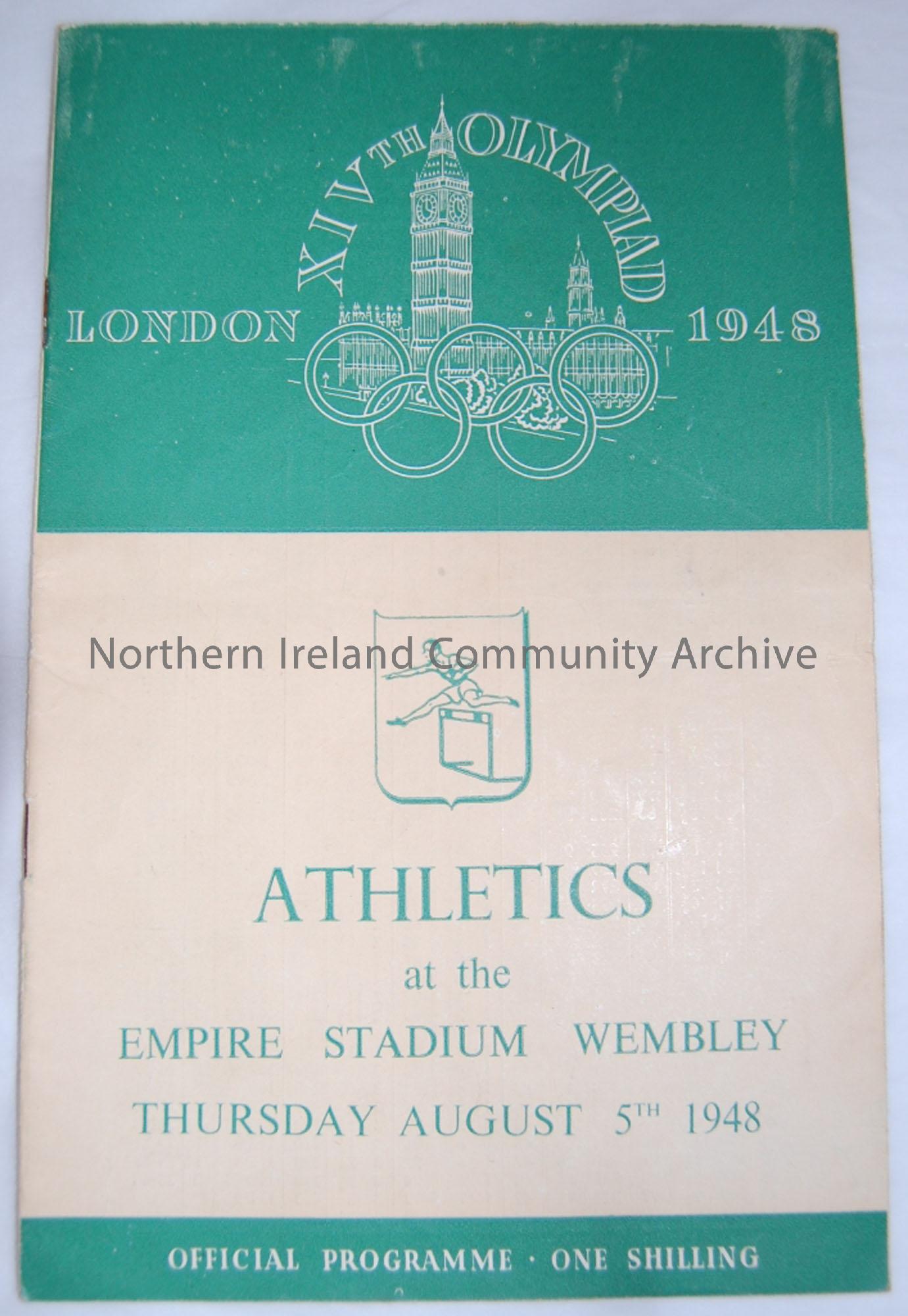 Athletics Programme from London Olympics, Empire Stadium Wembley, Thursday August 5th 1948. Illustrations include Olympic Rings and Houses of Parliame…