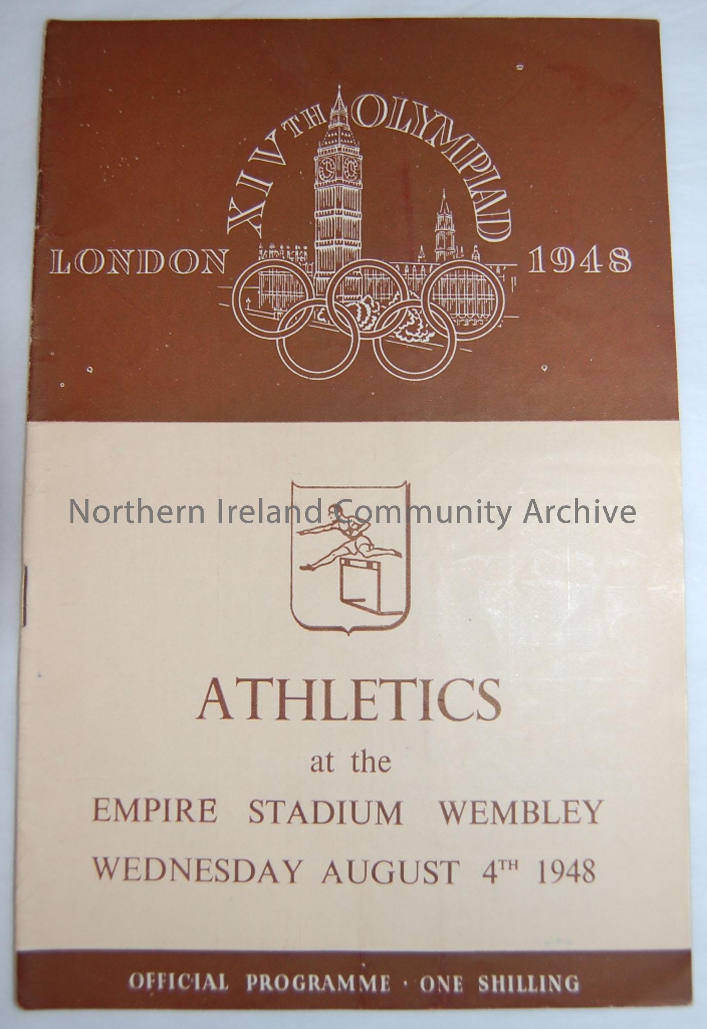 Athletics Programme from London Olympics, Empire Stadium Wembley, Wednesday August 4th 1948. Illustrations include Olympic Rings and Houses of Parliam…